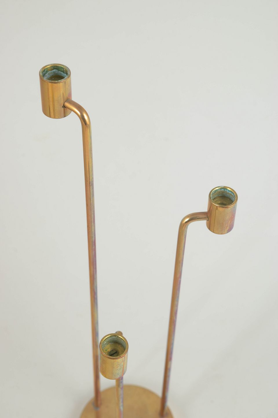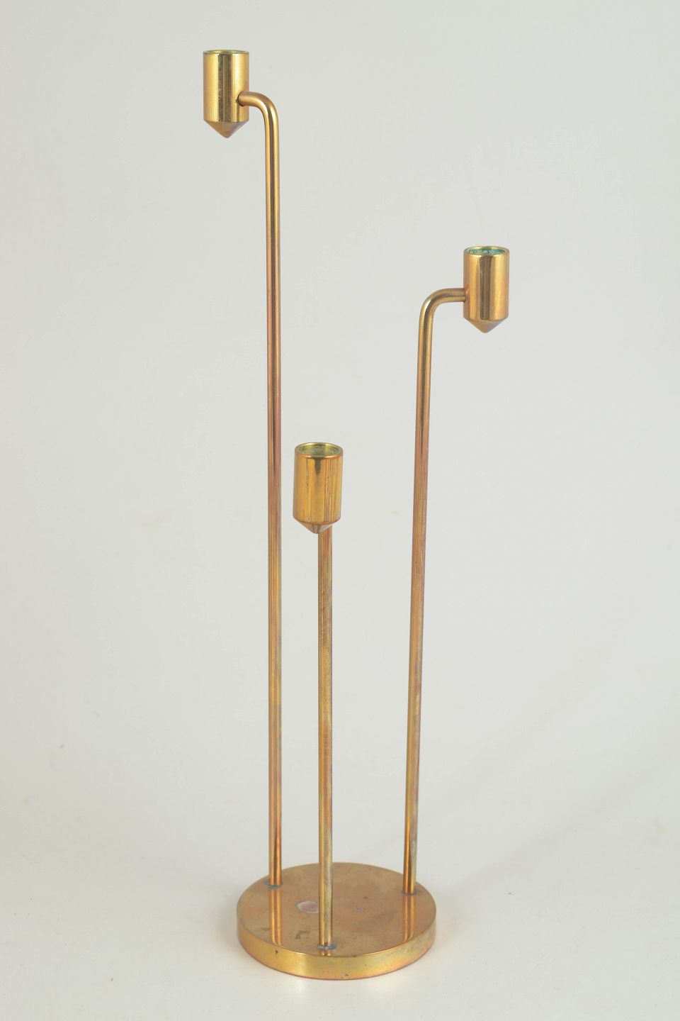 Skulpturel trearmet lysestage i massiv messing med slanke, vertikale arme i varierende højde. Stramt og elegant modernistisk formsprog, tydeligt forankret i nordisk design fra 1960’erne.
