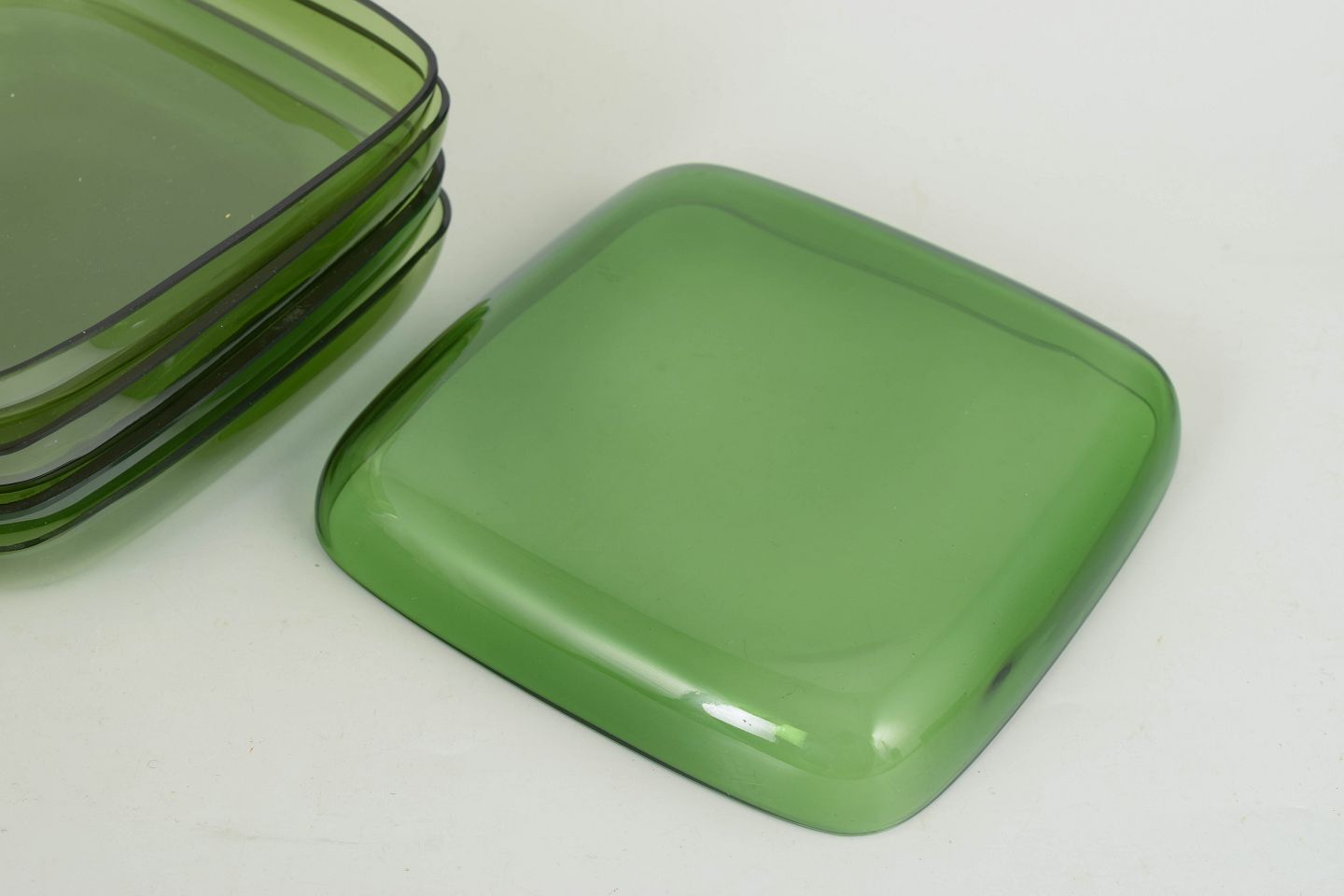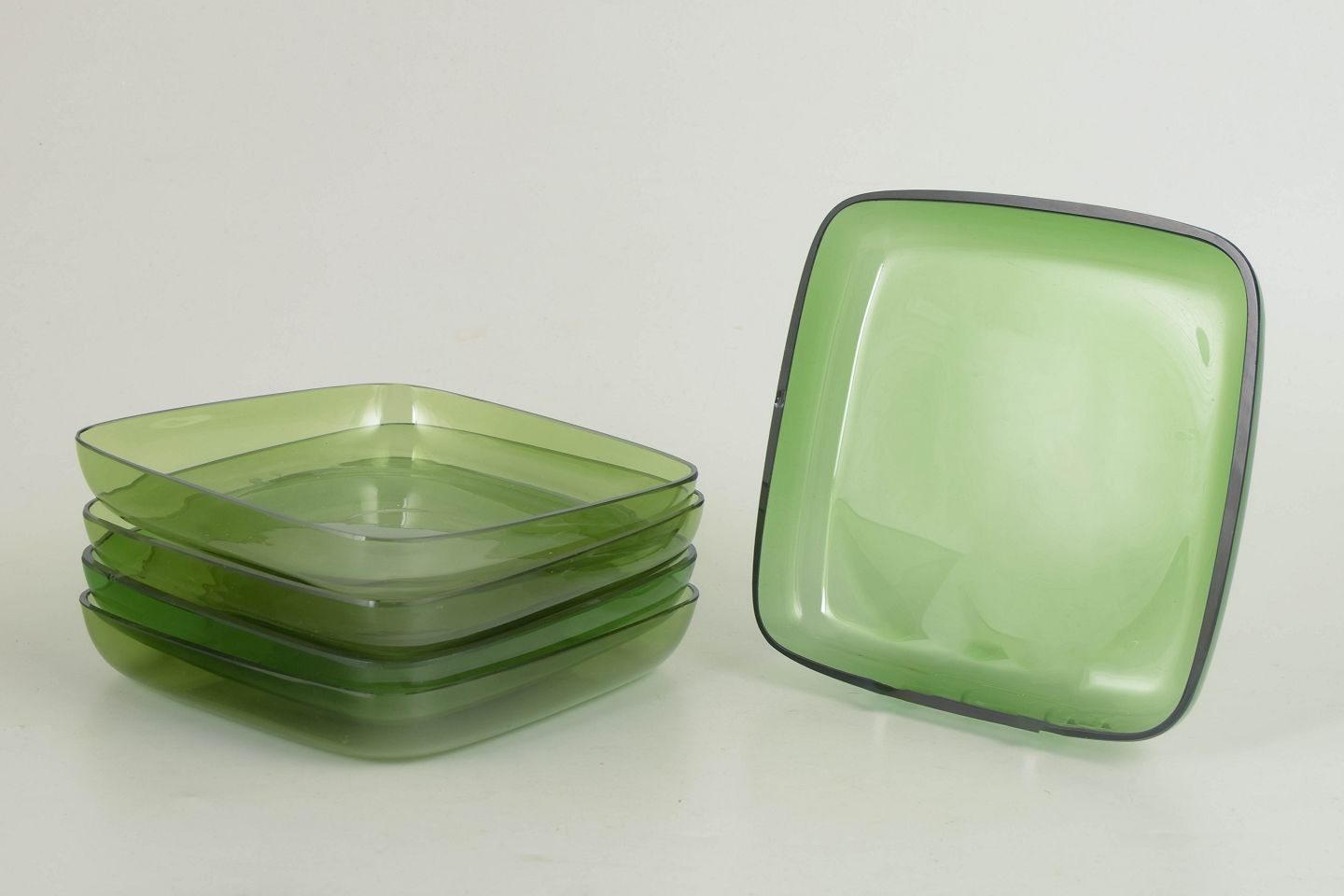 Sæt bestående af fem håndlavede tallerkener i grønt glas med blødt afrundede hjørner og let opadbøjet kant. Et enkelt og funktionelt formsprog med tydelig skandinavisk modernistisk karakter.