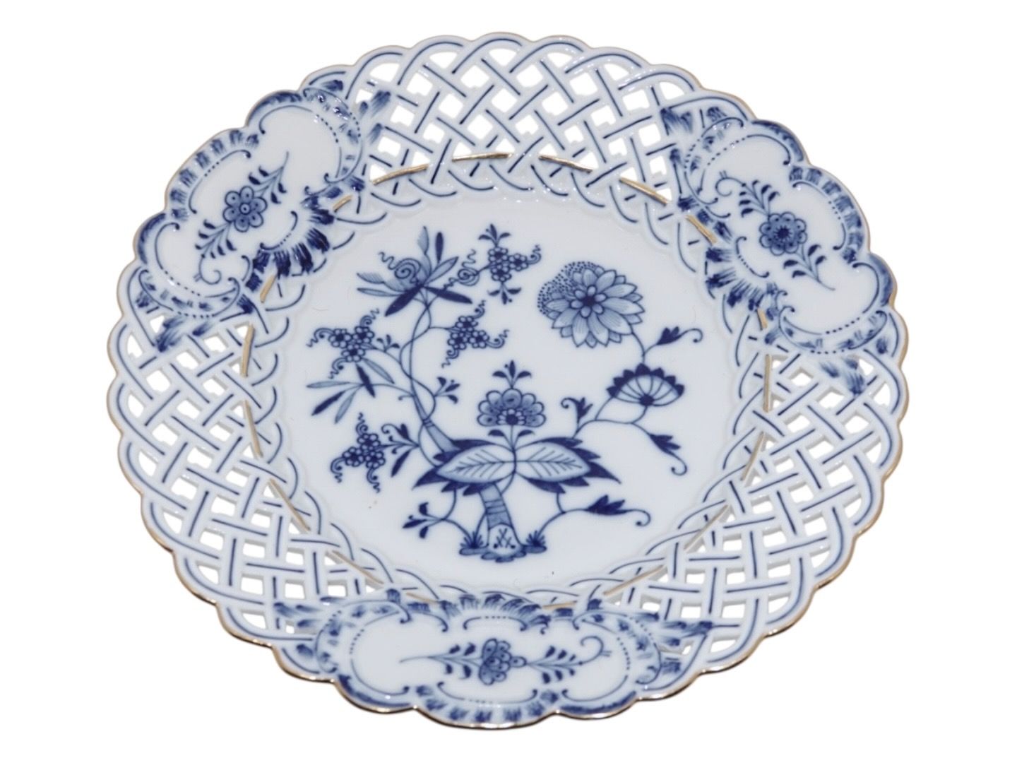 Meissen Tyskland, Blue Onion tallerken med dobbeltblonde og guldkant.