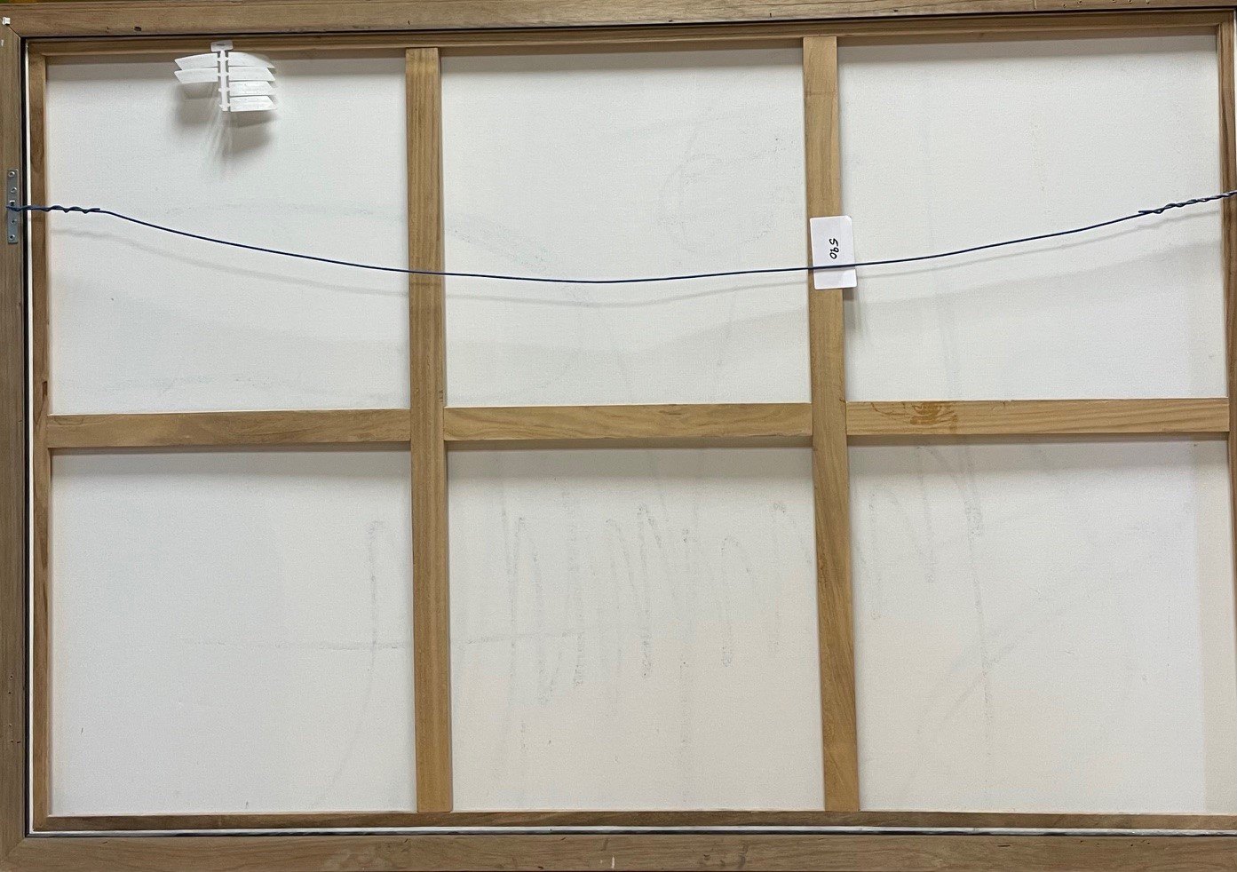 "Komposition" Oliemaleri på lærred, monteret i sølv svæveramme.