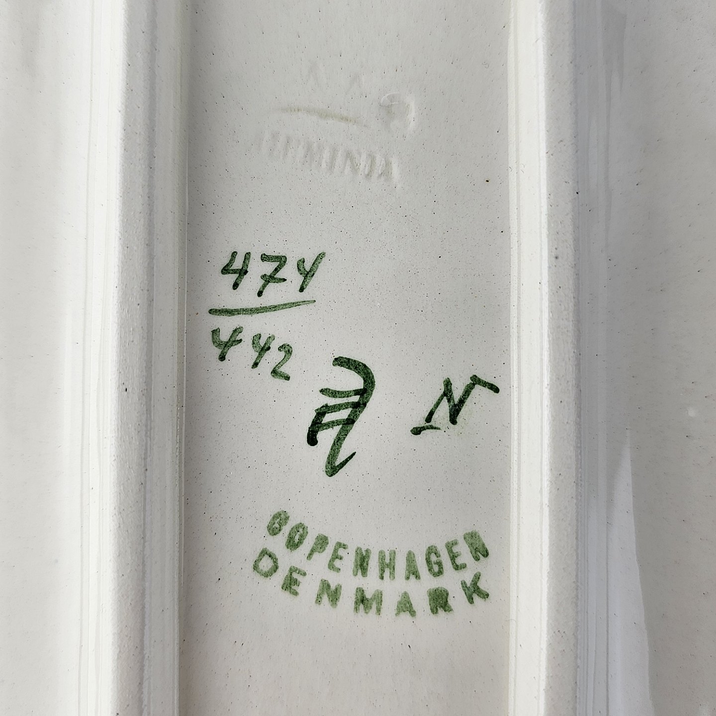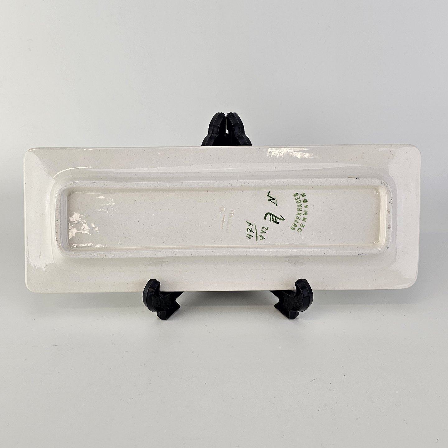 Pennebakke i fajance med dekoration af en gul fugl, blade og blå kant med blomster, flot stand.