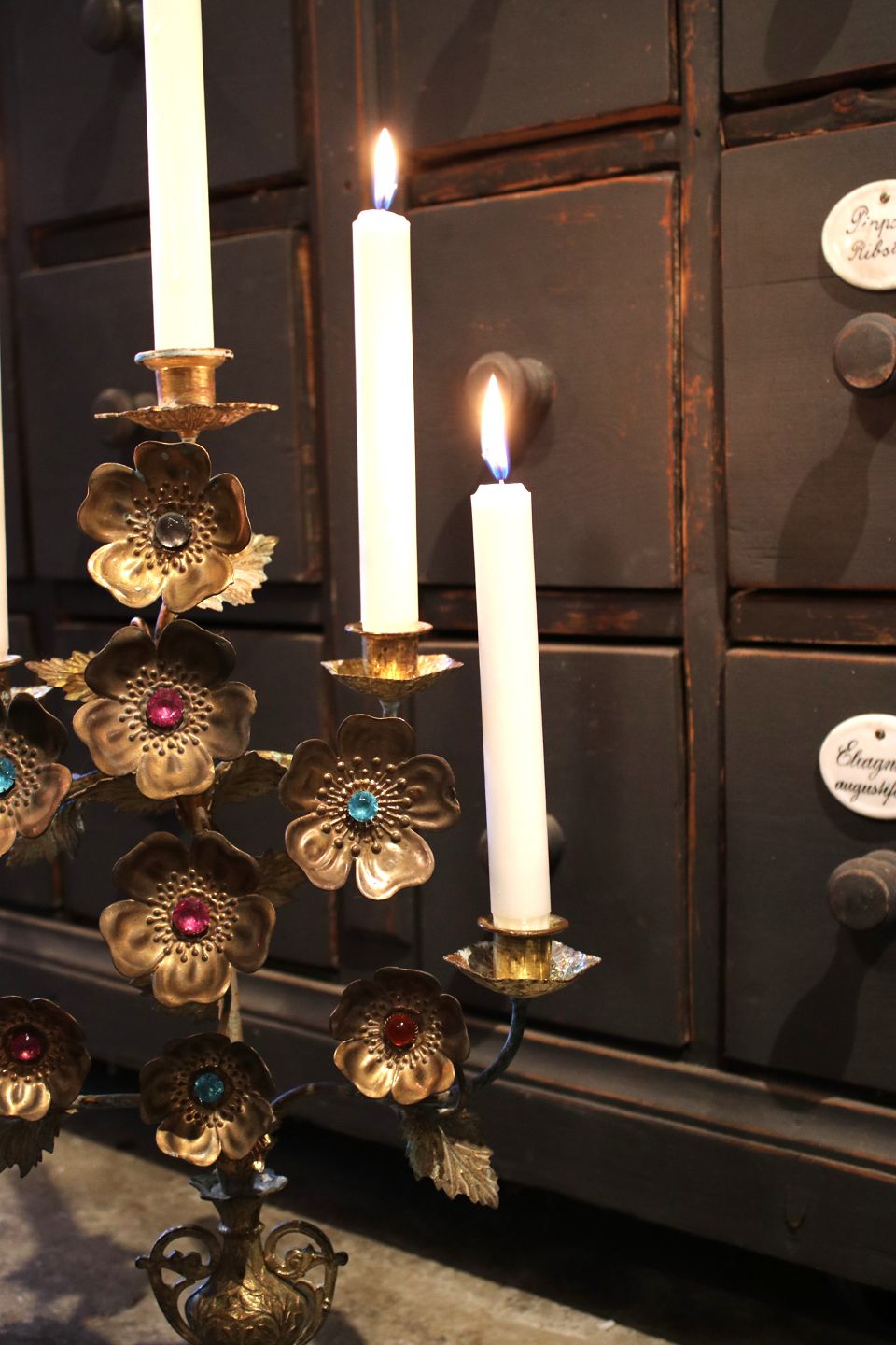 Antik Fransk kirkelysestage med plads til 5 stearinlys , dekoreret med masser af forgyldte blomster med farvet glassten.