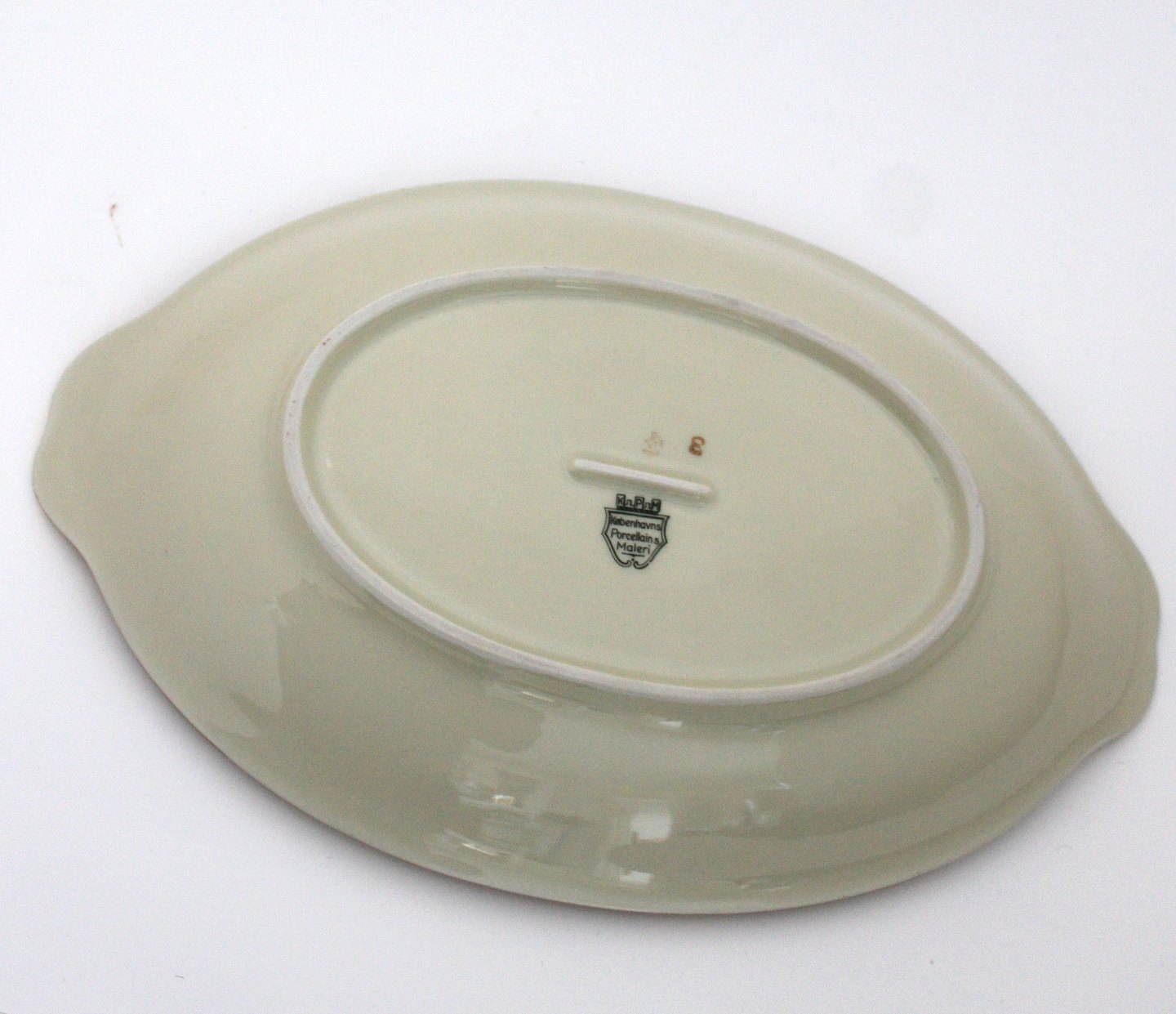 Kjøbenhavns Porcellains Maleri, Rosenborg, Brødbakke sjælden. Længde 29,5 cm. Bredde 19 cm. Højde 5 cm. Lettere brugsslid på guldkant. Pris: 350 kr. stk. Lager: 1