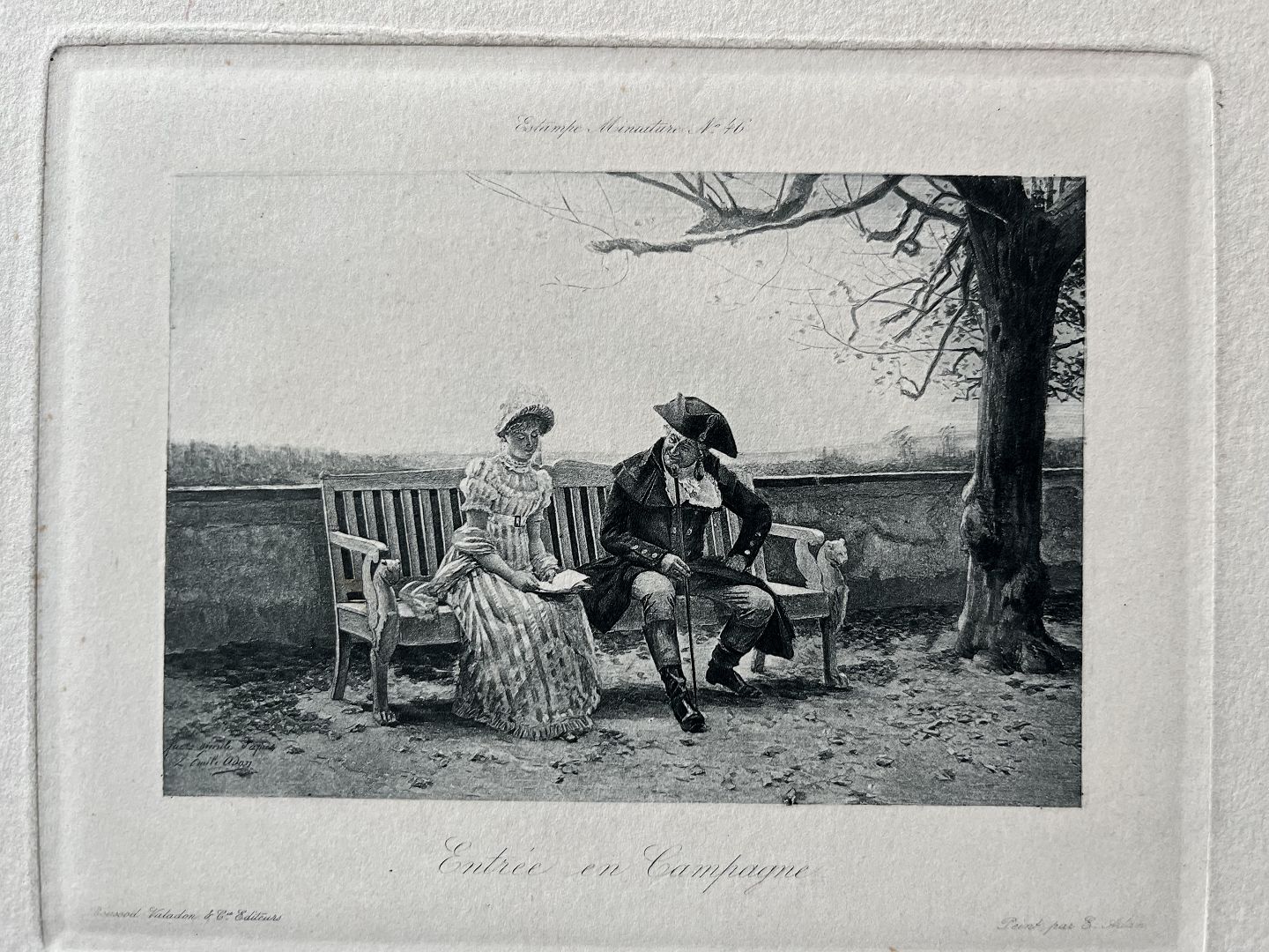 Radering af Louis-Emile Adan 1886 - En ældre mand kurtiserer en yngre dame på bænk-