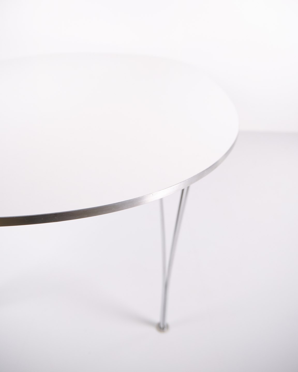 Super Ellipse spisebord model B614 designet af Piet Hein, Bruno Mathsson og Arne Jacobsen for Fritz Hansen. Hvid laminat. Ikonisk dansk designklassiker.