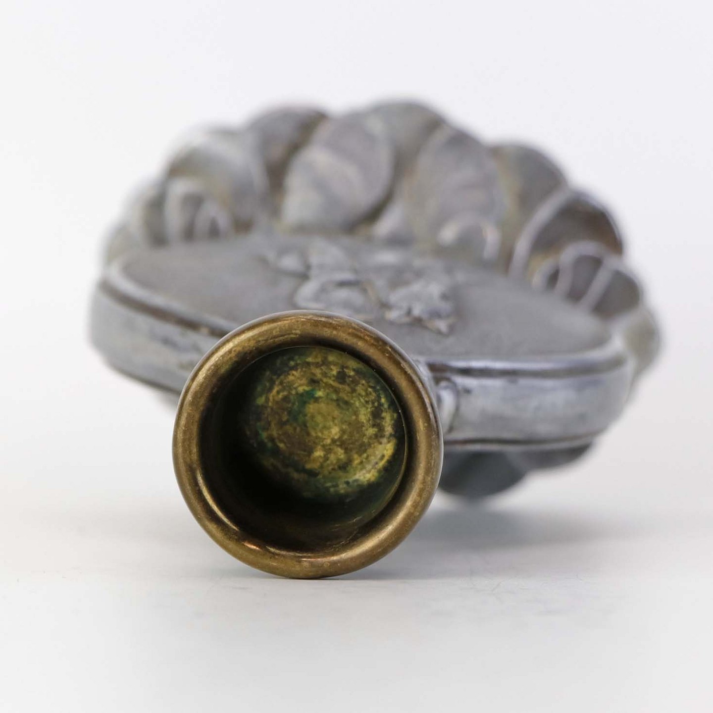 Lysestage i tin med messing dekoration og top med motiv af Kong Christian den 10. til hest med teksten 'Der rider en konge' og '1870-1945'