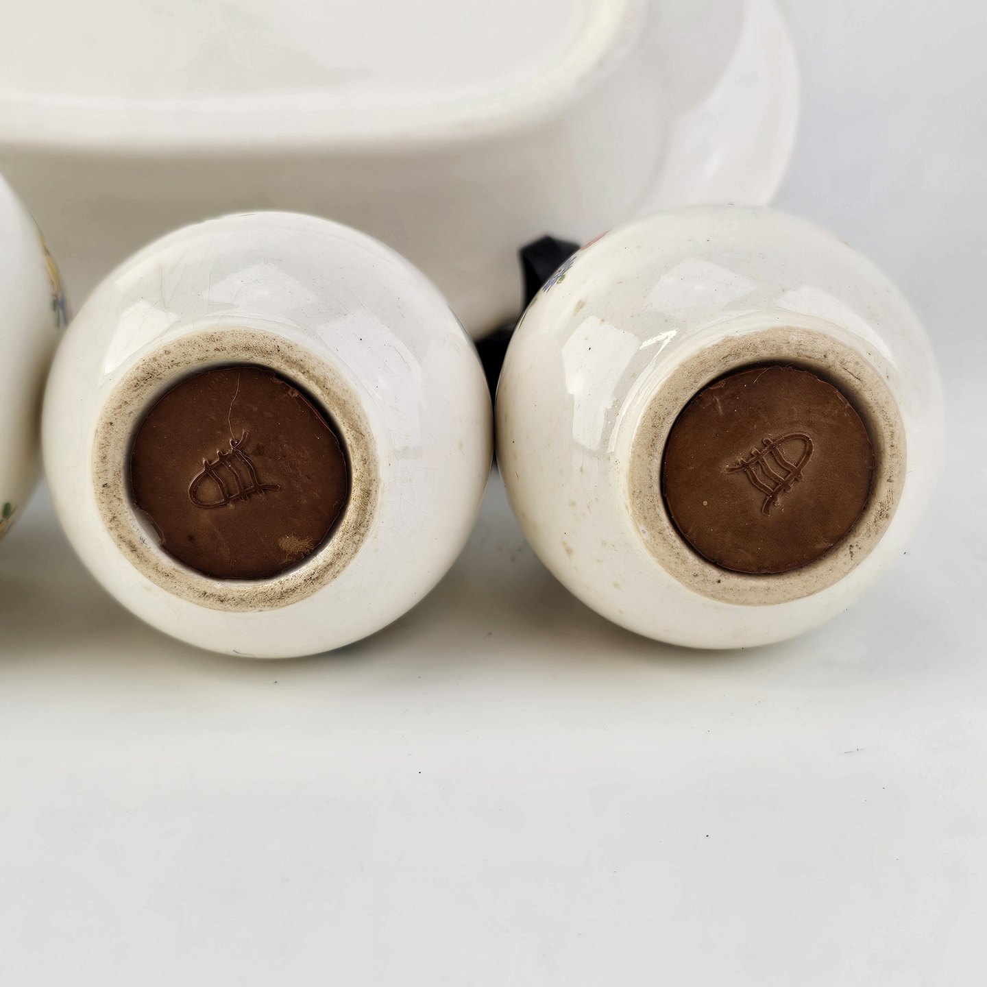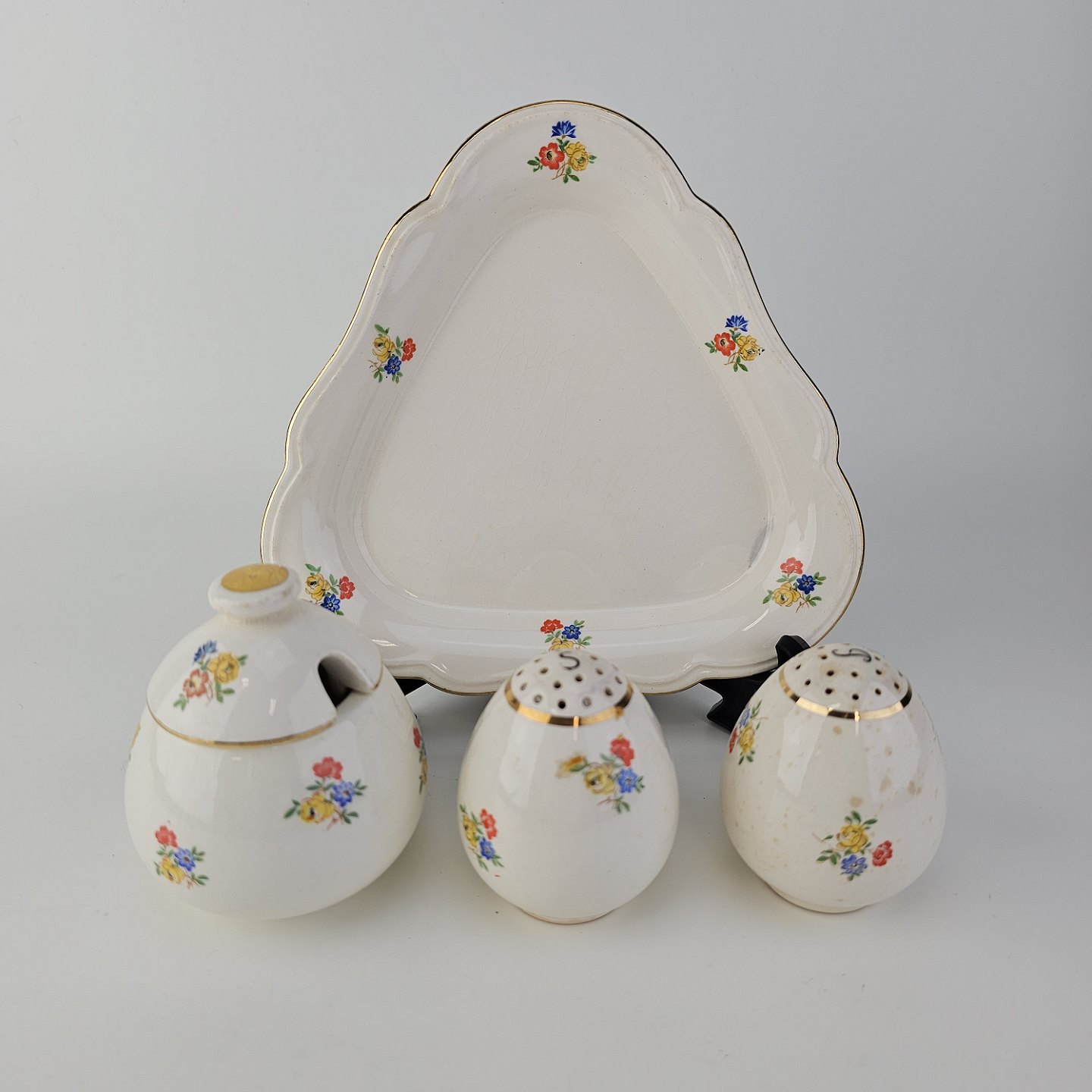 Trekantet fad med sennepskrukke, saltbøsse og peberbøsse i fajance fra stellet Anna Sofie
