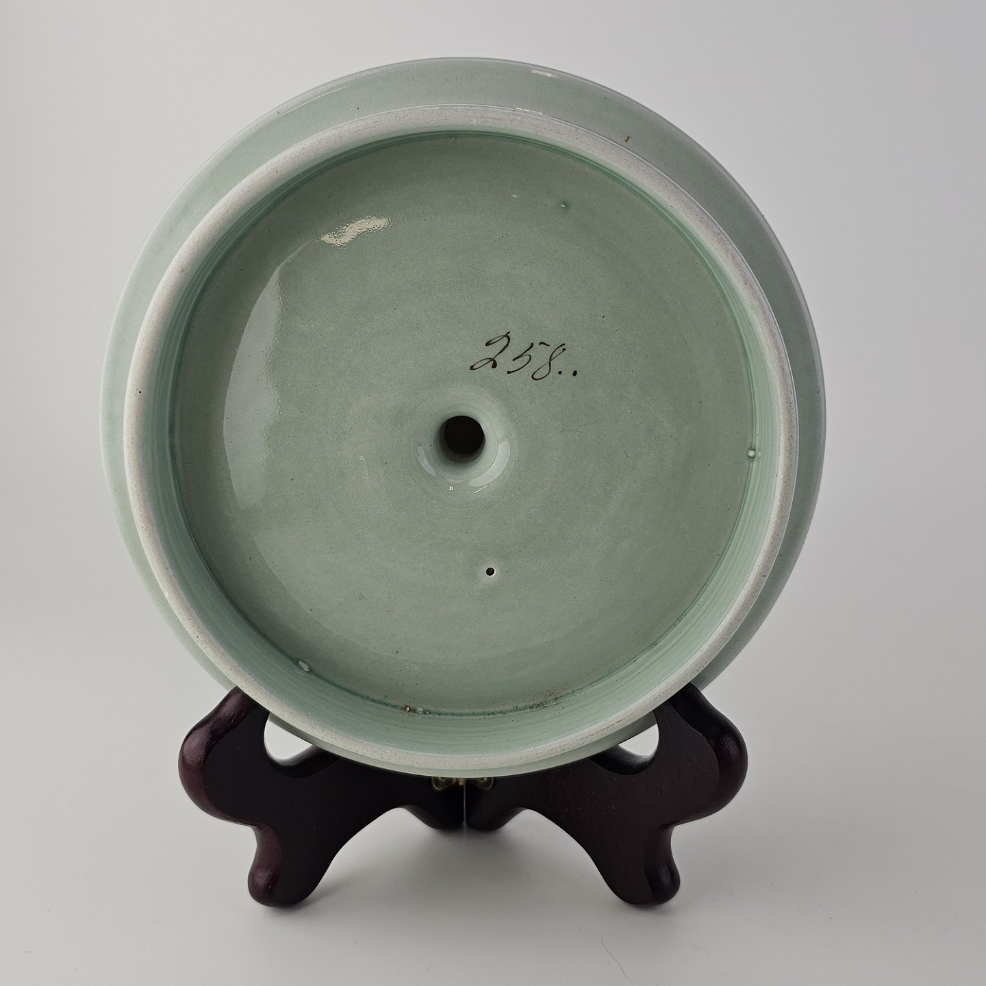 Stel i lysegrøn fajance med natur dekoration og flettet kant