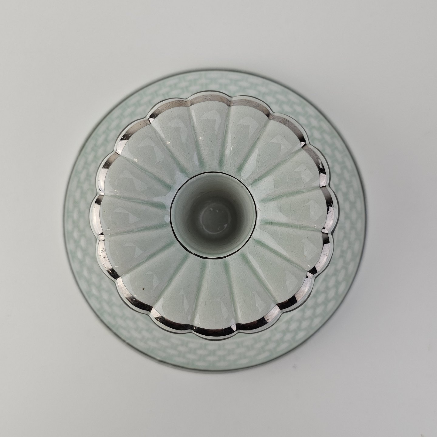 Stel i lysegrøn fajance med natur dekoration og flettet kant