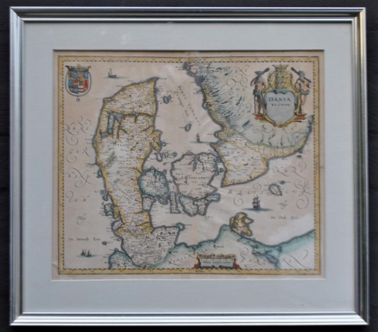 Willem Janszoon Blau (1571 - 1638) Holland: Generalkort over Danmark. 1634. Kobberstik, håndkoloreret. Usignert. 28 x 33 cm.