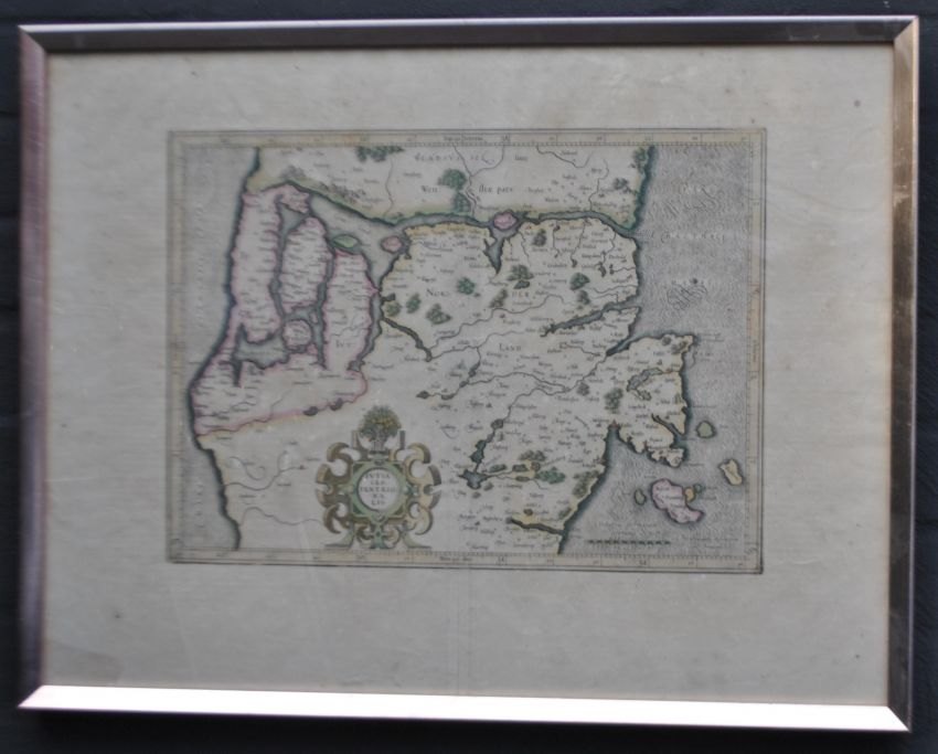 Mercator, Gerardus (1512 - 1594) Tyskland/Flandern: Specialkort over Midtjylland. Håndkoloreret kobberstik. Signeret i trykket. Udgivet 1595. Her: Fransk udgave fra 1607 eller 1609. 29 x 41 cm.