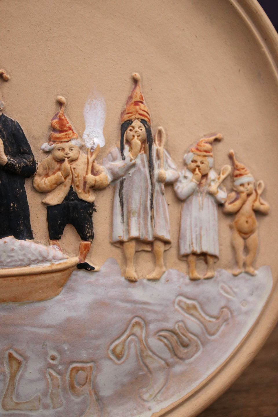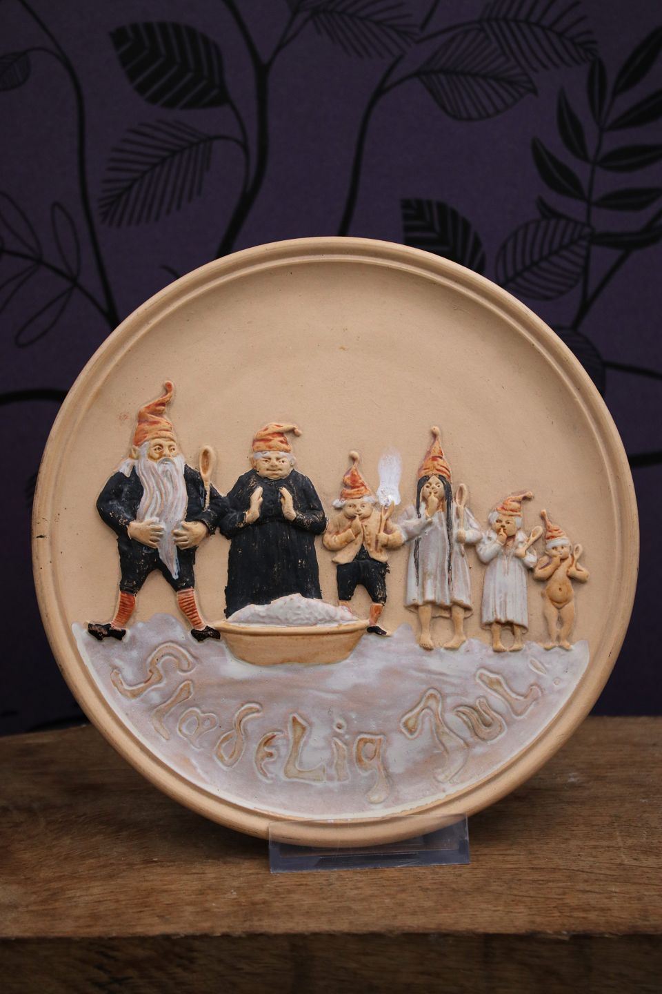 Gammel Jule platte i terrakotta med motiv af nisse familie samlet om risengråden...