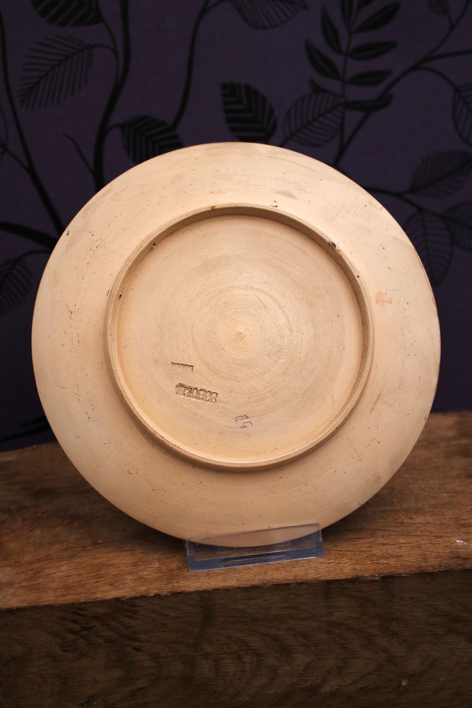 Gammel Jule platte i terrakotta med motiv af nisse familie samlet om risengråden og Glædelig jul skrevet forneden. Dia.: 18,5cm.