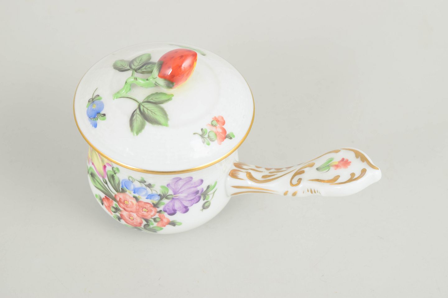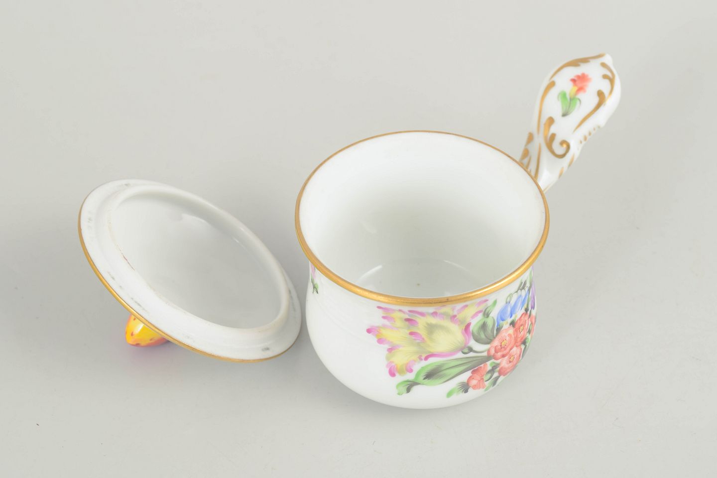 Håndmalet bouillonkop i glaseret porcelæn med blomsterdekoration i rosa, lilla, blå og grønne nuancer. Rund korpus med let svunget hank, låg med knop formet som knopskud samt diskret forgyldning langs kant og detaljer.