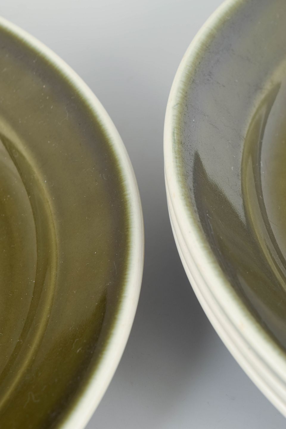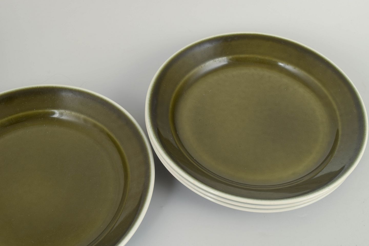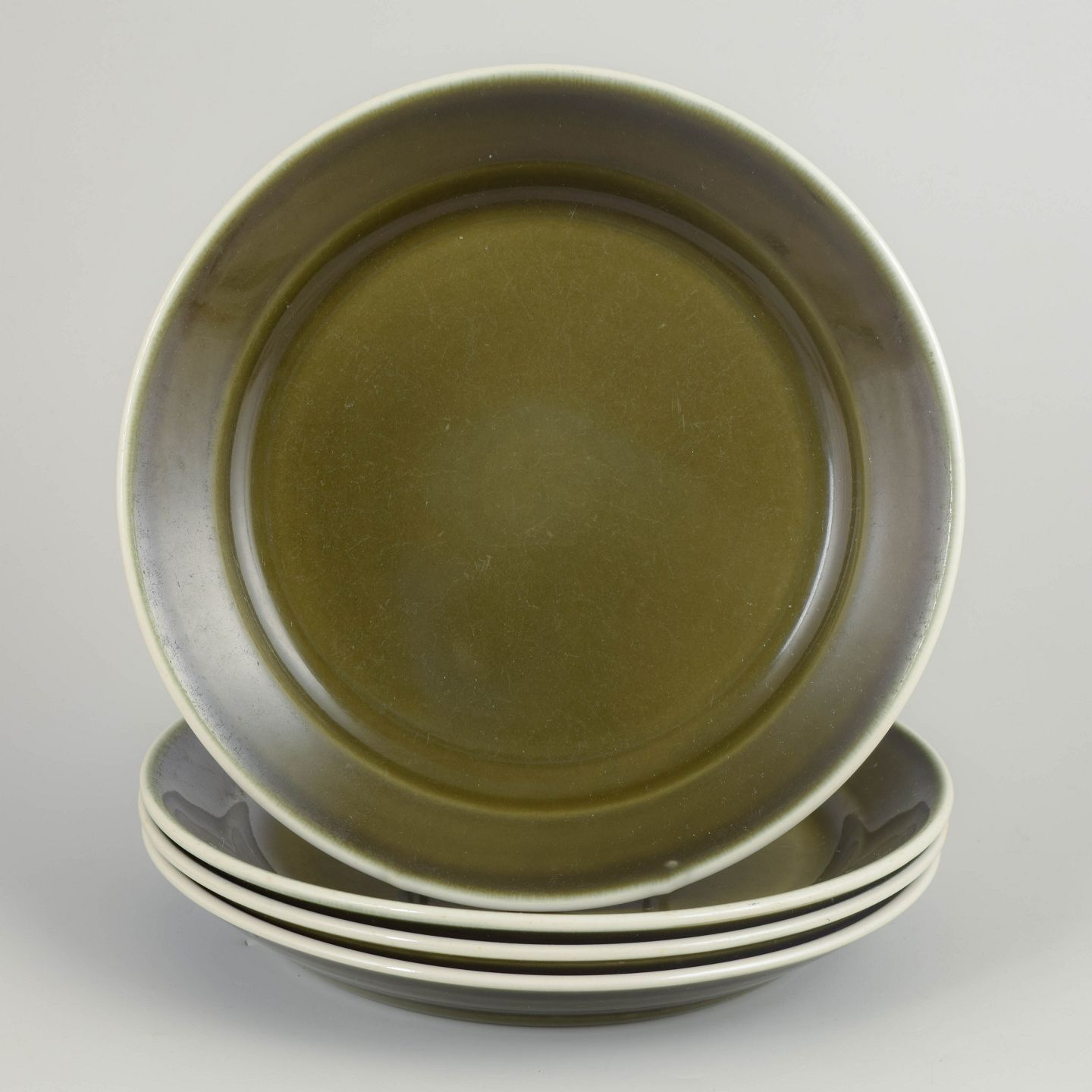 Sæt bestående af fire middagstallerkener i glaseret stentøj fra serien "Vardag". Tallerkenerne har et enkelt, funktionelt formsprog med bred fane og dyb spejl, udført i karakteristisk grøn glasur med mørk kant, typisk for Stig Lindbergs hverdagsorienterede design fra 1970’erne.
