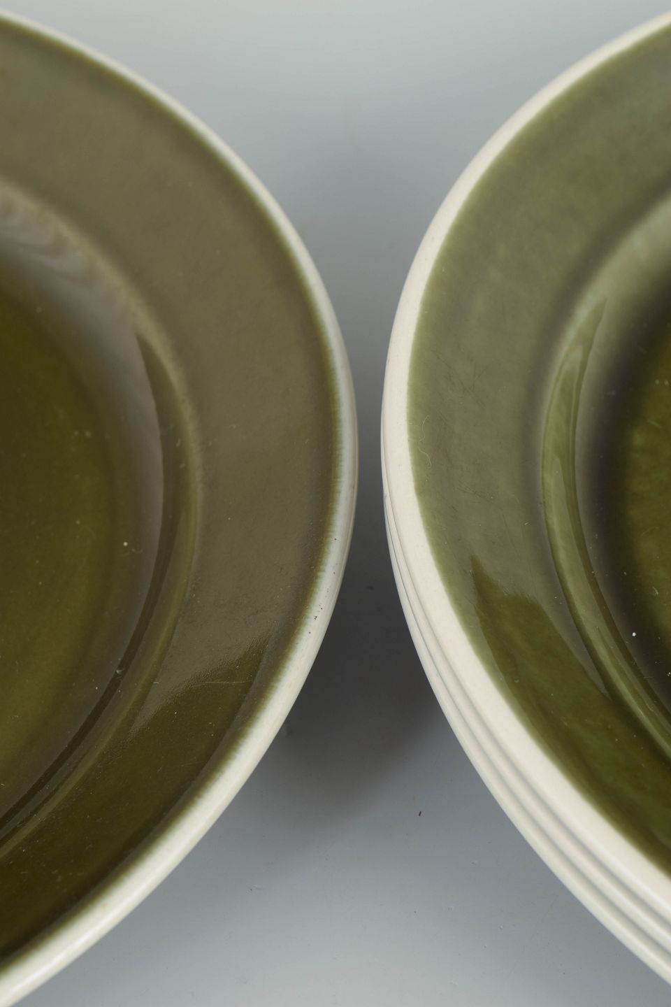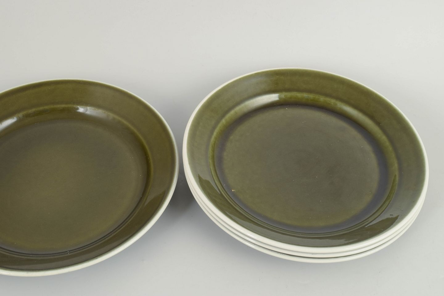 Sæt bestående af fire middagstallerkener i glaseret stentøj fra serien "Vardag". Tallerkenerne har et enkelt, funktionelt formsprog med bred fane og dyb spejl, udført i karakteristisk grøn glasur med mørk kant, typisk for Stig Lindbergs hverdagsorienterede design fra 1970’erne.
