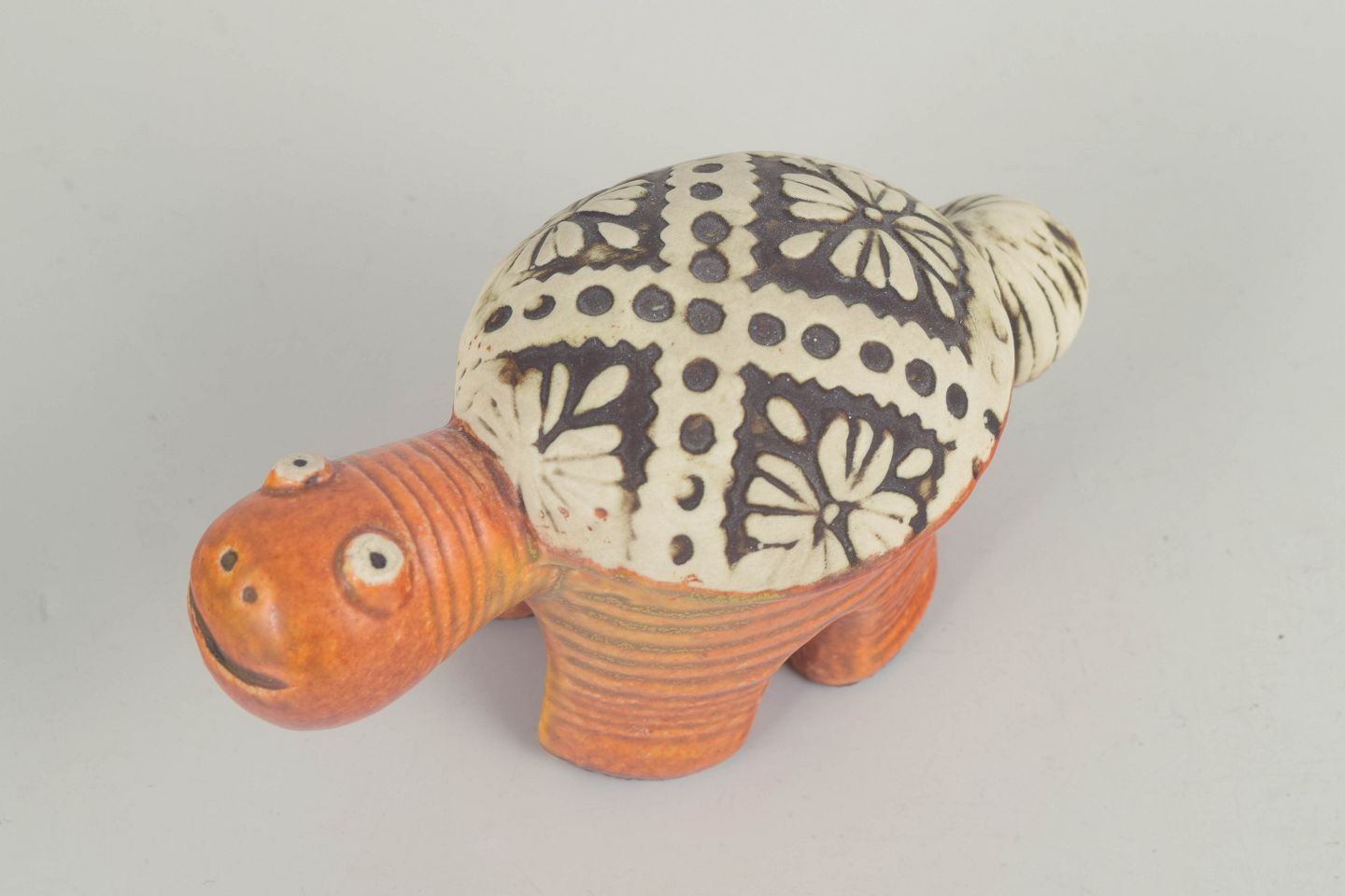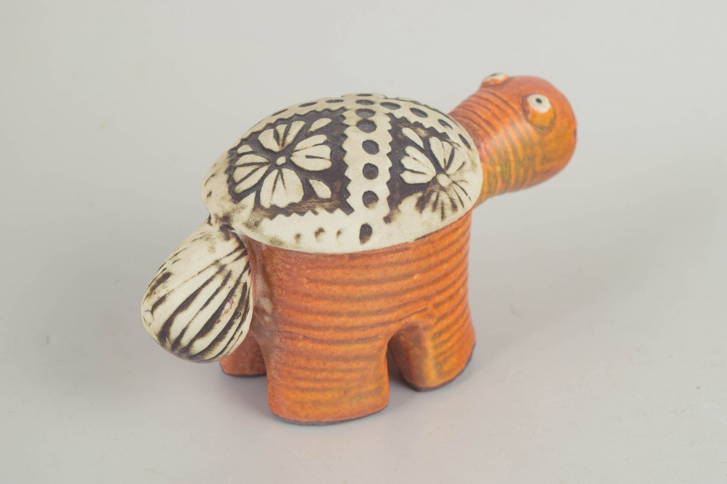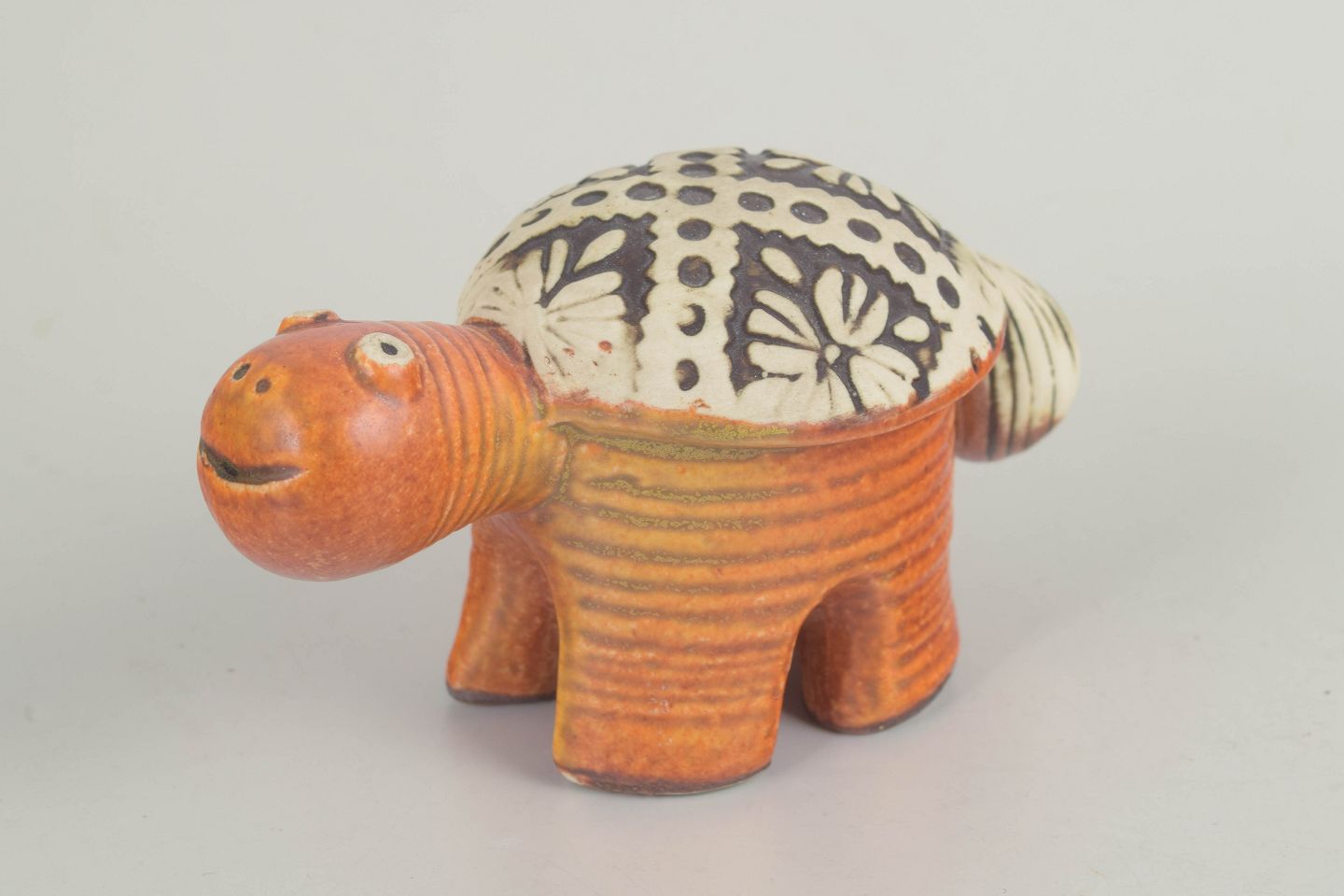 Stiliseret skildpadde i stentøj med kompakt, næsten arkitektonisk kropsform og korte, kraftige ben. Udført med varm, orangebrun glasur på kroppen og kontrasterende skjold dekoreret med grafiske blomster- og prikmotiver i sort og råhvid. Et karakteristisk eksempel på Lisa Larsons figurative formsprog fra 1970’erne, hvor humor og enkelhed kombineres med stærk dekorativ virkning.