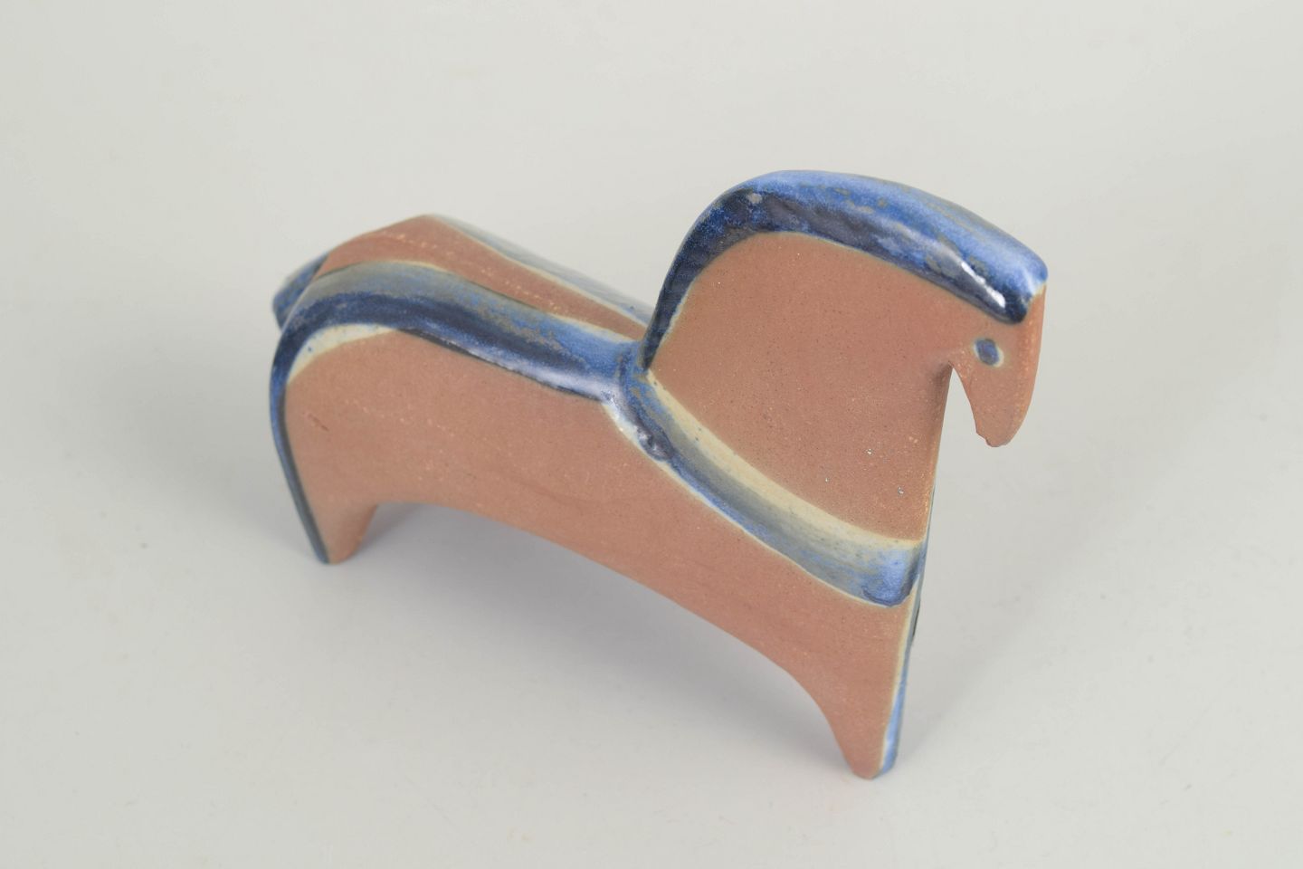 Stiliseret hest i stentøj med kompakt, arkitektonisk form og bløde, afrundede konturer. Udført med mat, sandfarvet glasur kombineret med dæmpede blå og lyse nuancer, karakteristisk for Lisa Larsons formsprog. Figuren er fra 1970’erne og bærer originalt Gustavsberg-mærke.