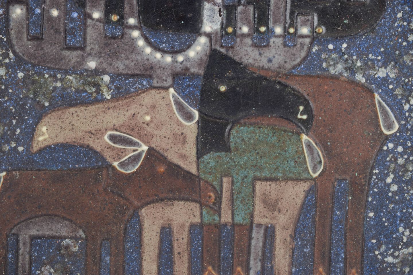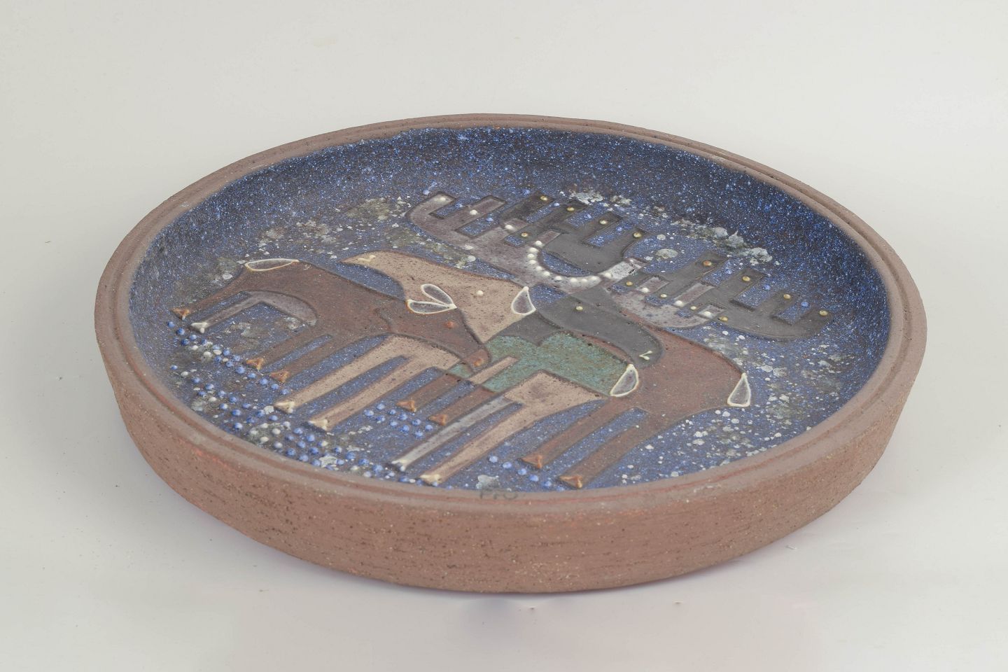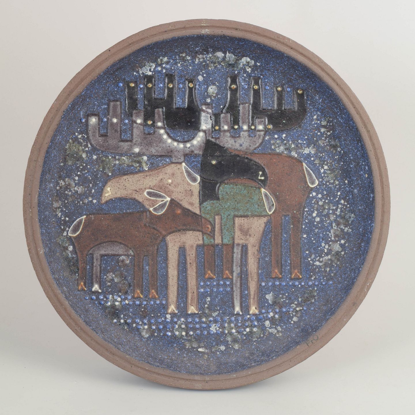 Sjældent, meget stort rundt fad i glaseret stentøj med karakteristisk dekor i blå og jordfarvede nuancer, udført med stiliserede elge i et grafisk, 1970’er-præget formsprog. Overfladen har et levende, spættet glasurudtryk, der fremhæver motivets kontrast og dybde.