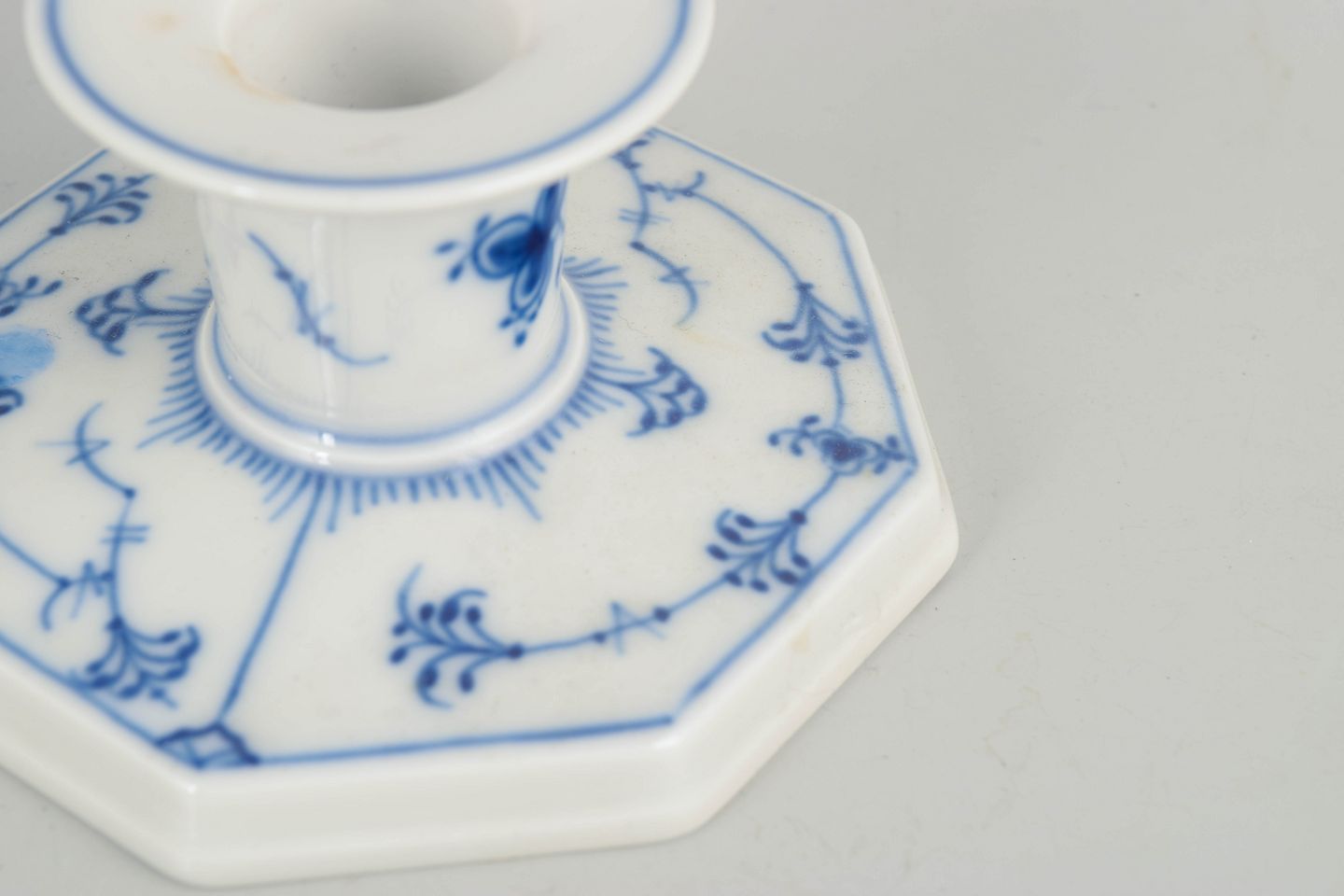 Musselmalet riflet er Royal Copenhagens mest ikoniske stel, kendetegnet ved den riflede form og det håndmalede blå underglasurmaleri. Selv mindre interiørdele som lysestager blev udført med samme håndværksmæssige omhu som service- og borddele, hvilket giver et harmonisk og tidløst helhedsudtryk.