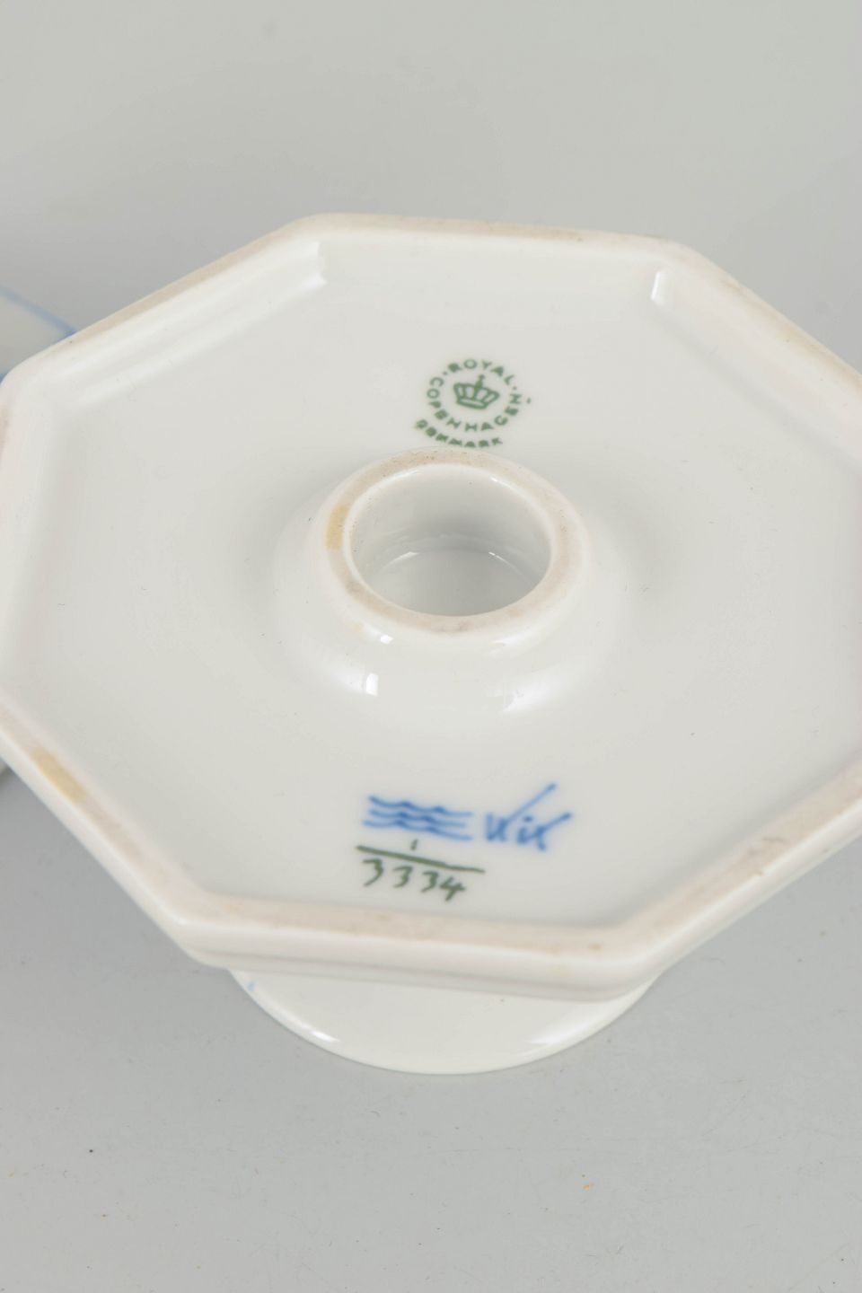 Par rillede lysestager i glaseret porcelæn med håndmalet underglasurdekoration i koboltblå. Ottekantet fod med lav, balanceret profil og cylindrisk lysholder. Model 1/3334.