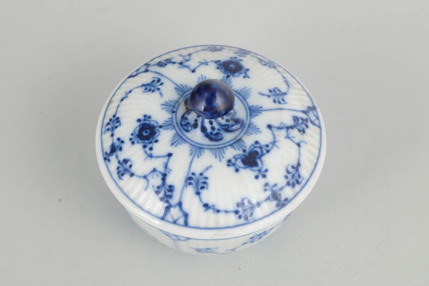 Rillet sukkerskål i glaseret porcelæn med håndmalet underglasurdekoration i koboltblå. Klassisk rund form med tilhørende låg afsluttet med knop.
