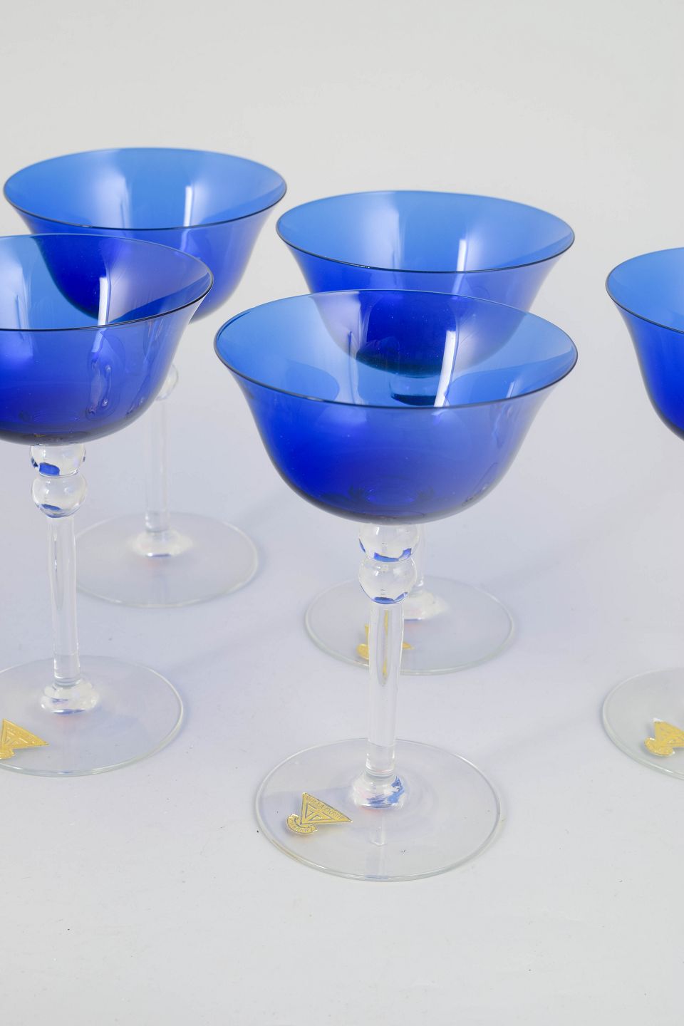Sæt bestående af fem håndlavede champagneglas i kunstglas med dybblå cuppa og klar, elegant stilk. Glassene har et balanceret og tidstypisk formsprog, hvor den farvede skål står i kontrast til den transparente fod og stilk. Et karakteristisk udtryk for svensk kunstglas fra 1960’erne og 70’erne, hvor farve og funktion blev forenet i en enkel og raffineret form. Modellen er udført som coupeformede champagneglas.