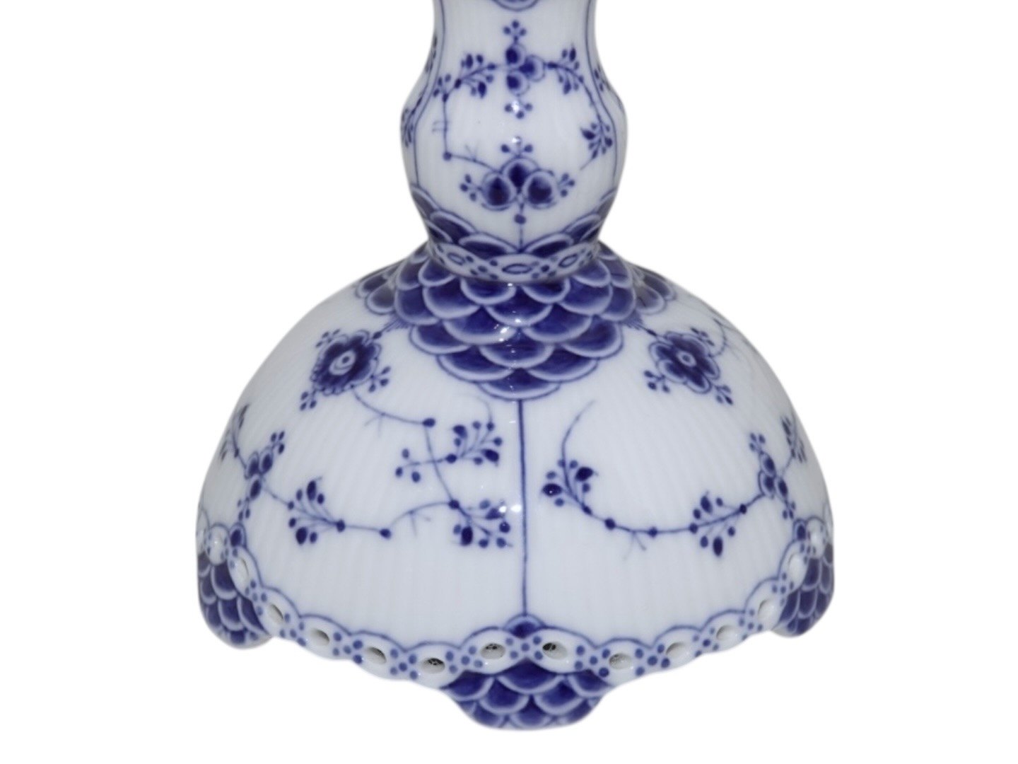 Royal Copenhagen Musselmalet Riflet, sjælden bordlampe monteret med en blå skærm. Den hører til Musselmalet Riflet men er med Helblonde kant.
