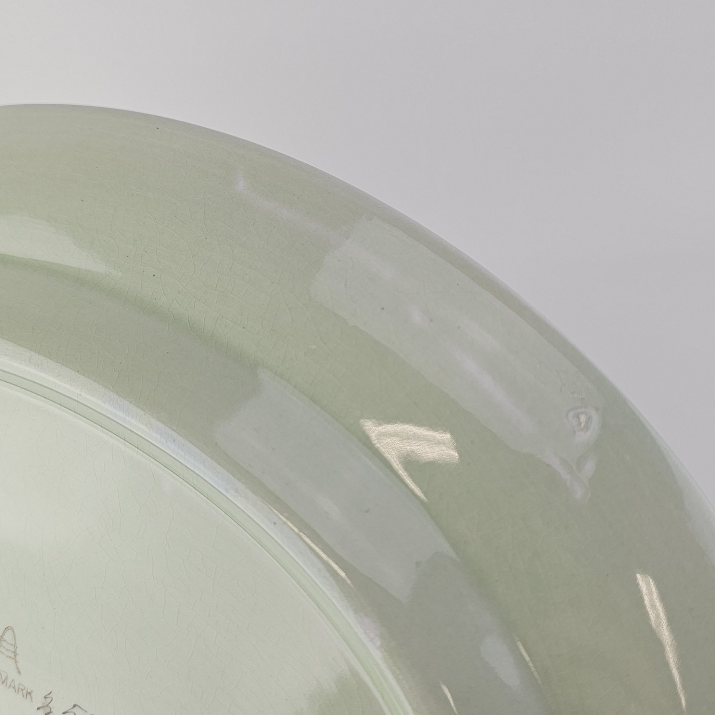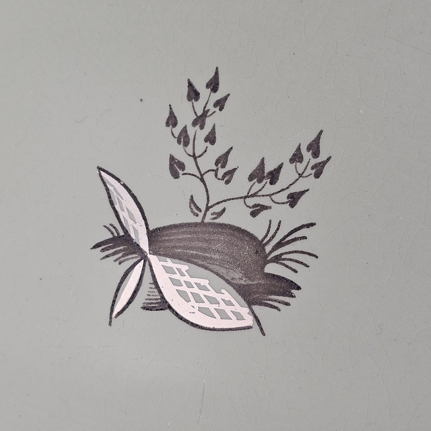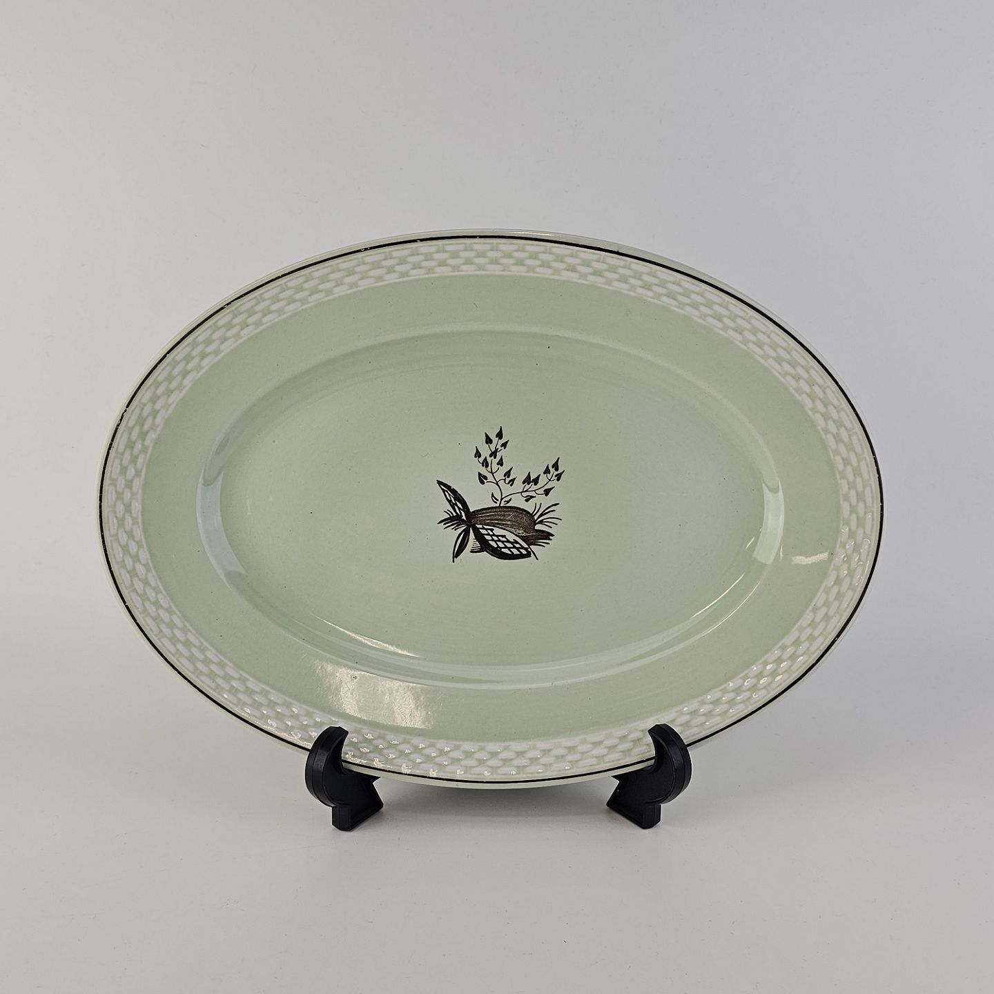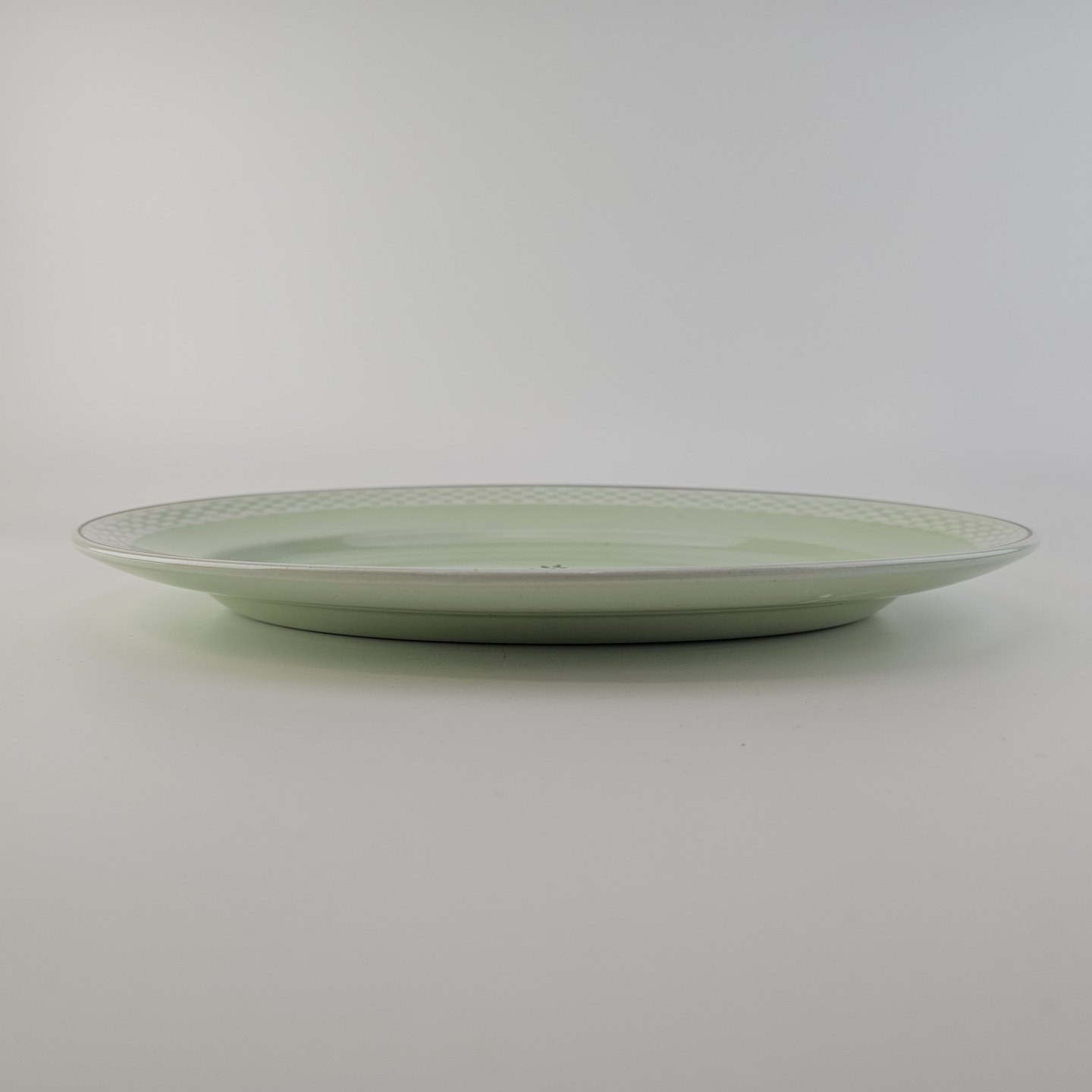 Stel i lysegrøn fajance med natur dekoration og flettet kant