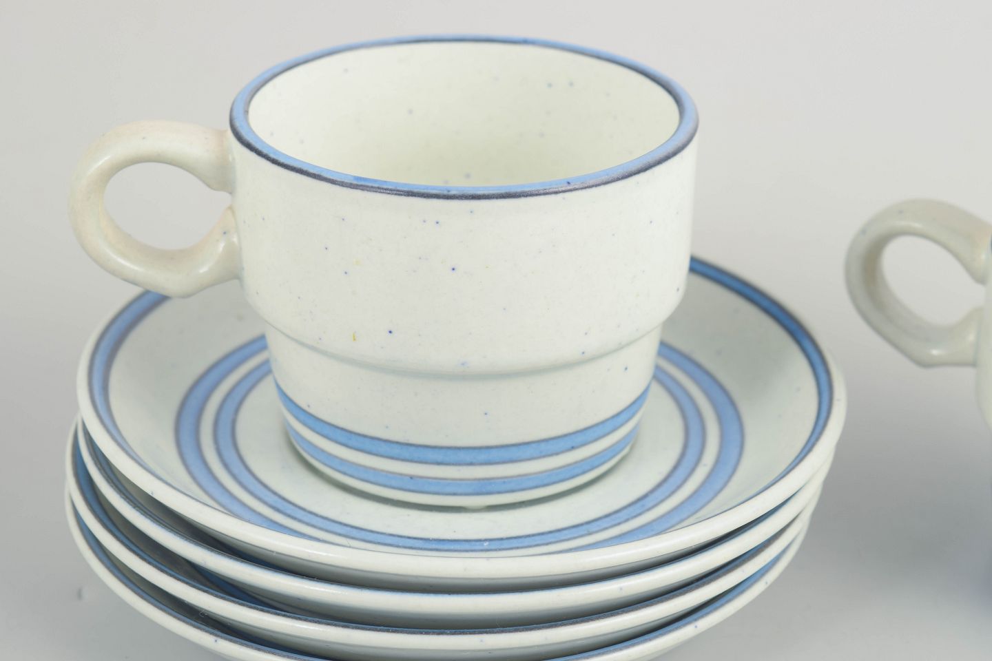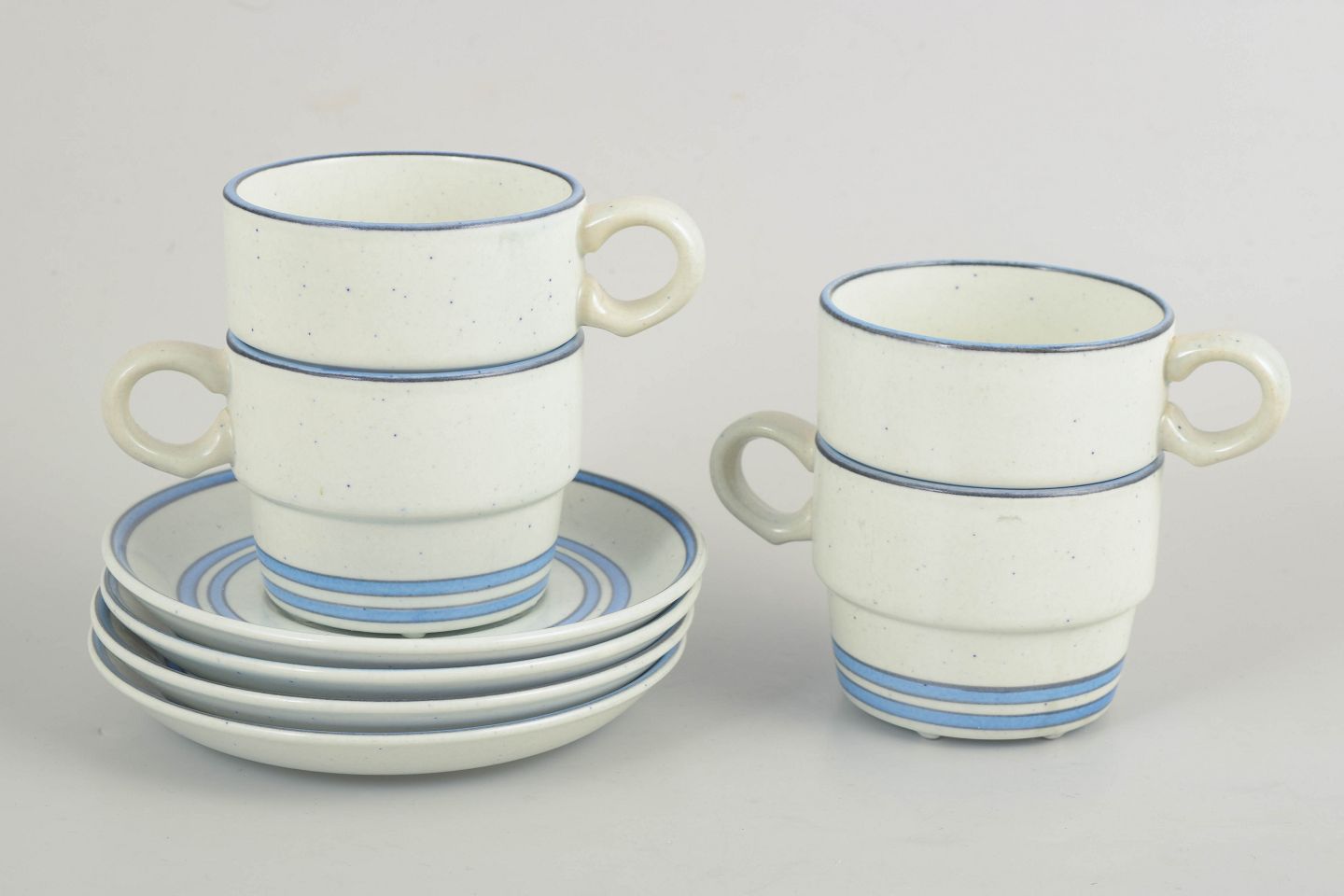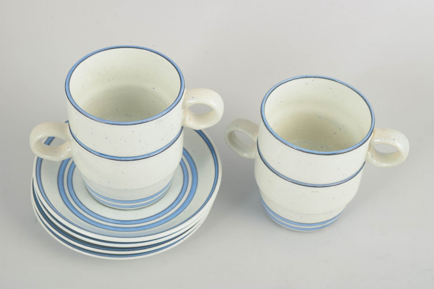 Sæt med fire kaffekopper med tilhørende underkopper i fajance fra “Dart”-serien. Enkle cylindriske former med let udadbøjet hank og diskret dekoration i blå linjer på lys bund, karakteristisk for Stig Lindbergs funktionelle og grafiske formsprog fra perioden.