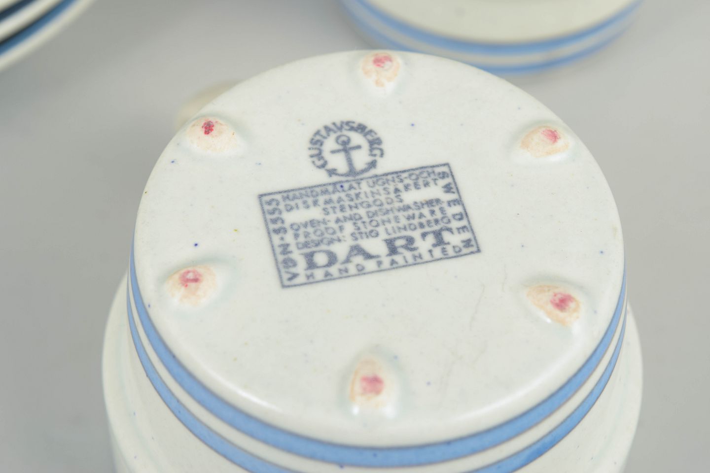 Stig Lindberg var en af Gustavsbergs mest betydningsfulde designere og spillede en central rolle i udviklingen af svensk keramik i midten af det 20. århundrede. I 1960’erne og 70’erne arbejdede han med rene former og grafiske dekorationer, der kombinerede funktionalitet med et legende og moderne udtryk. “Dart”-serien er et eksempel på denne tilgang og er i dag eftertragtet blandt samlere af skandinavisk design.