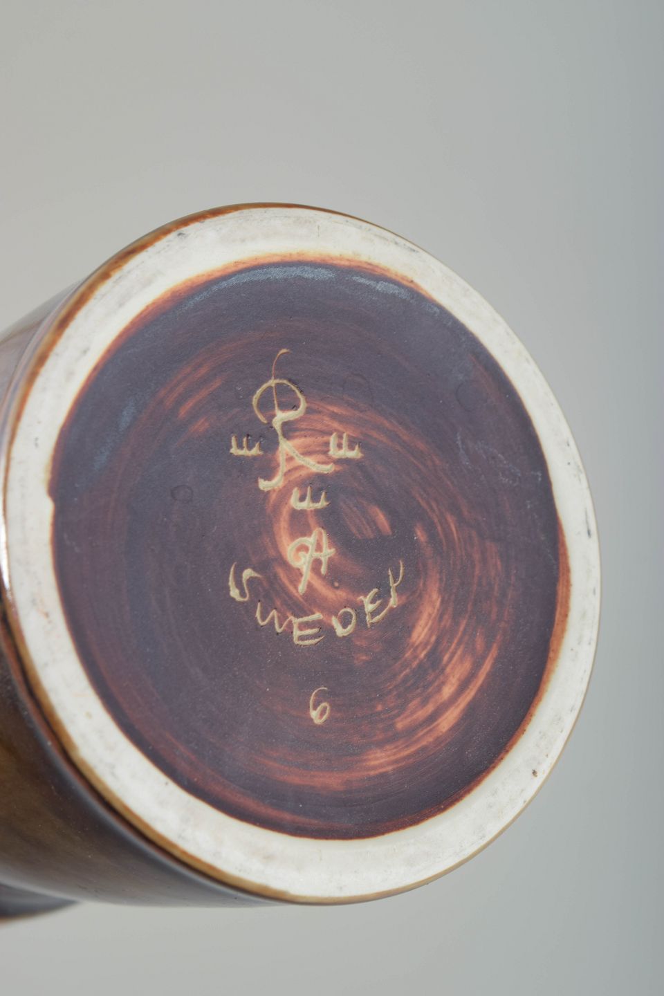 Slank, cylindrisk vase i stentøj med markant lodret formopbygning og let profilerede ringe. Overfladen er dækket af levende, løbende glasurer i varme brune, ravfarvede og beige nuancer med tydelig dybde og variation, karakteristisk for Rörstrands kunstneriske stentøjsproduktion i 1970’erne.