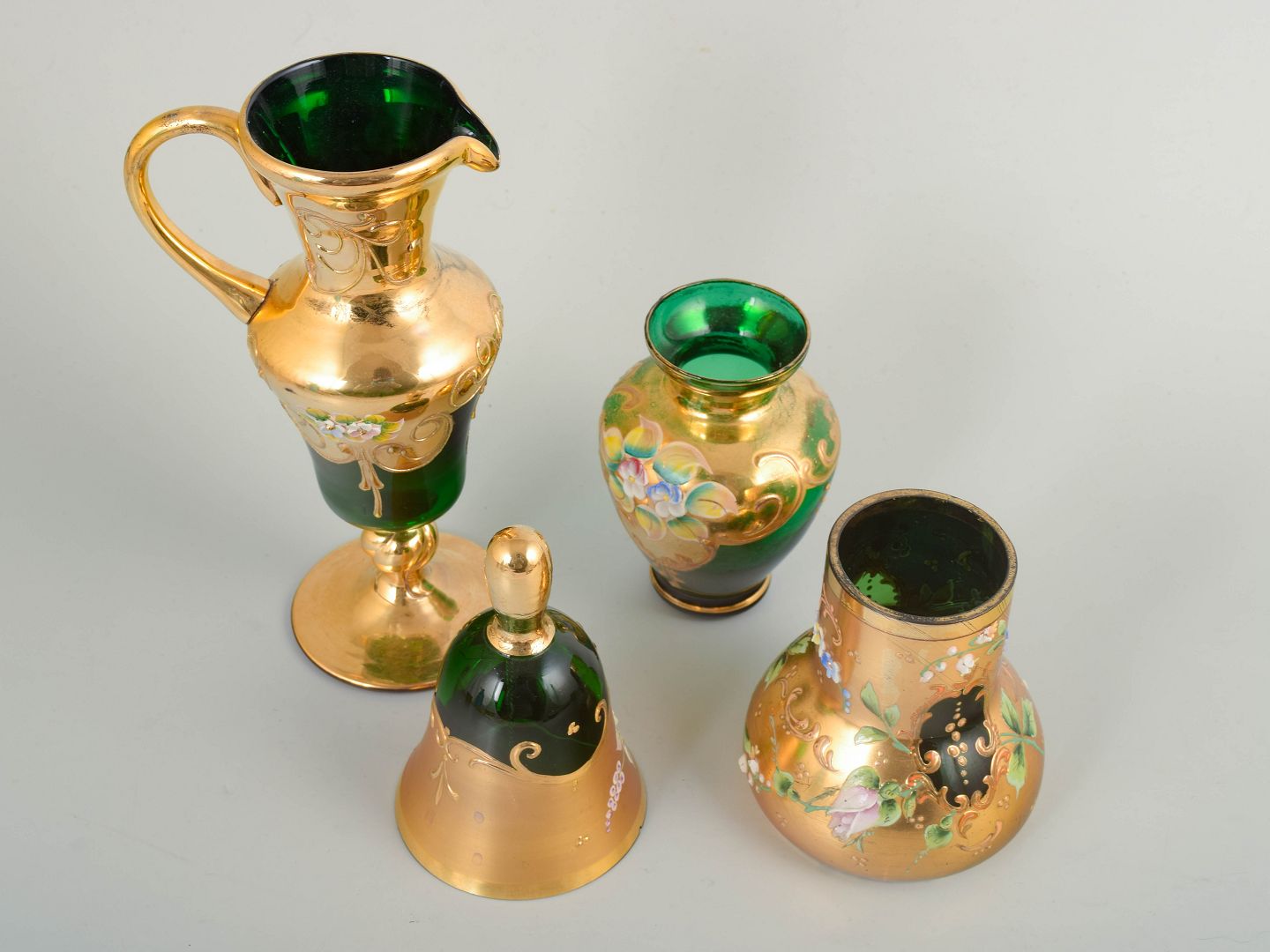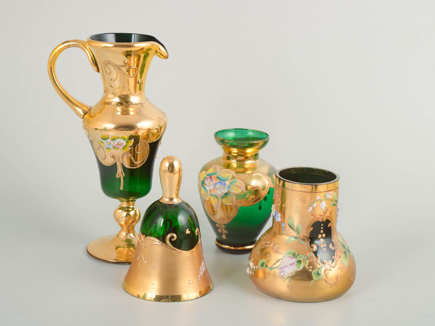 Dekorativt sæt bestående af fire dele i grønt glas med rig guldfarvet dekoration og emaljemalede blomster. Sættet omfatter en lille kande, en klokkeformet del med knop, samt to vaser i varierende former. Håndlavet arbejde udført i Bøhmen, med tydelige variationer i form og proportioner.