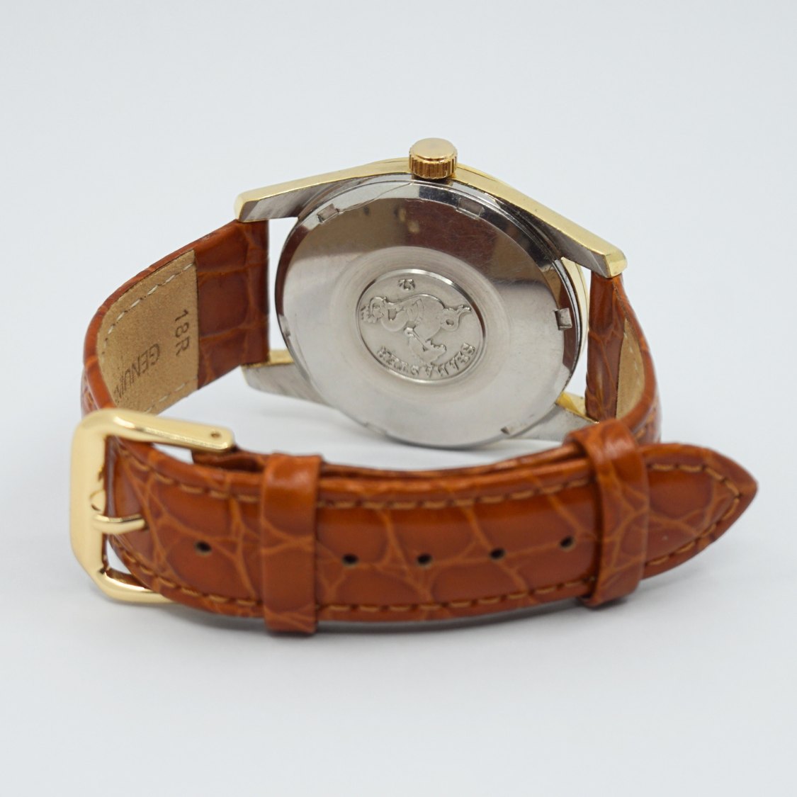 Omega armbåndsur, model Seamaster i stål med guldkappe. Ref. 14701-4. Cal: 562-1. Omega herreur årgang 1963. Automatic. Diameter 34 mm. Nyrenoveret og med ny brun læderrem. Meget fin stand.