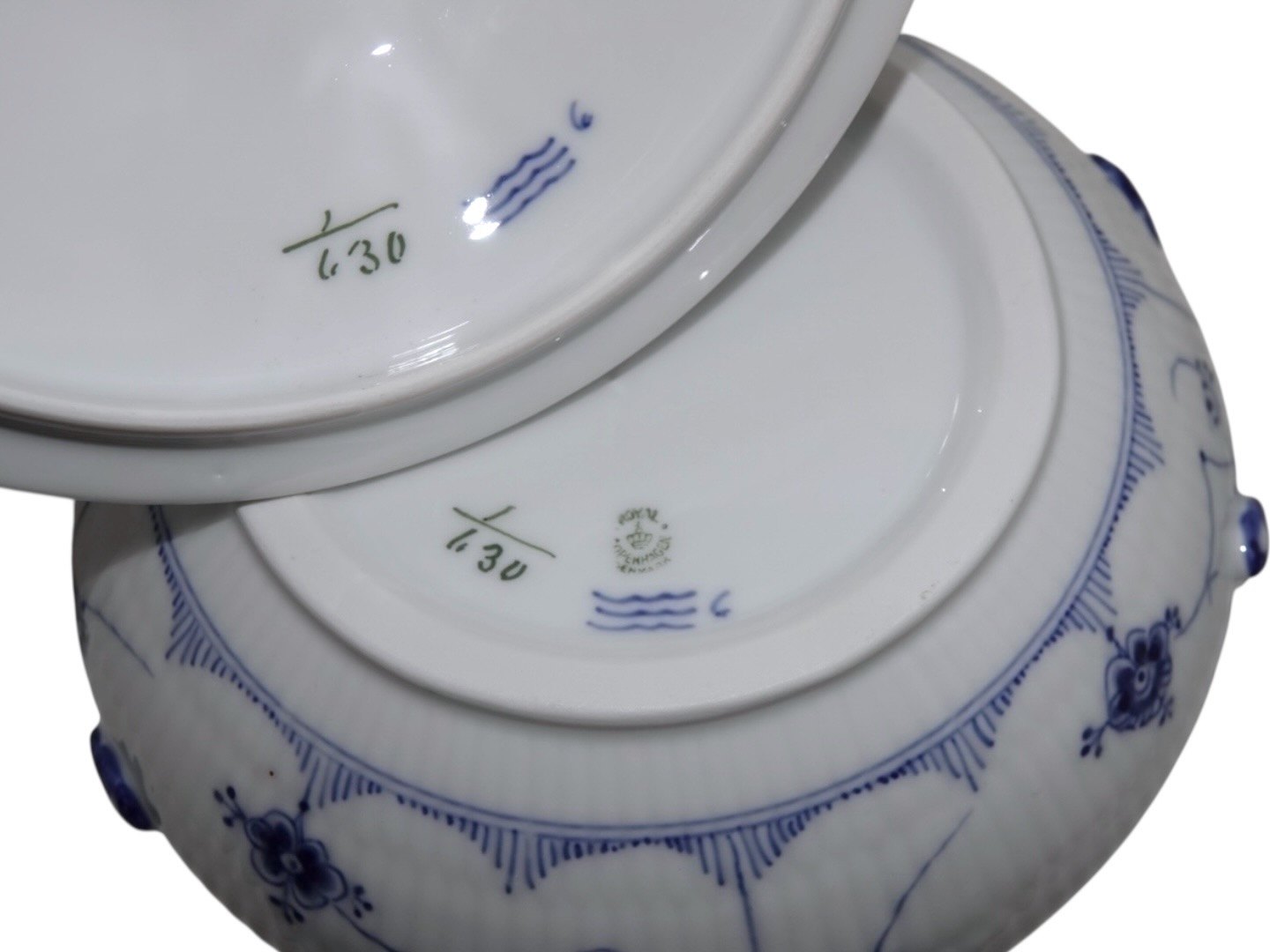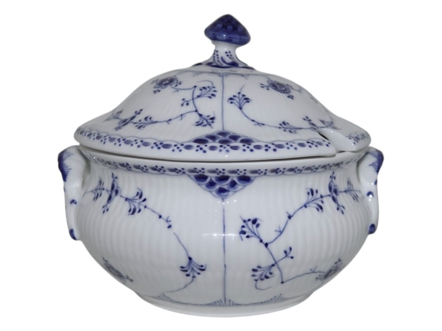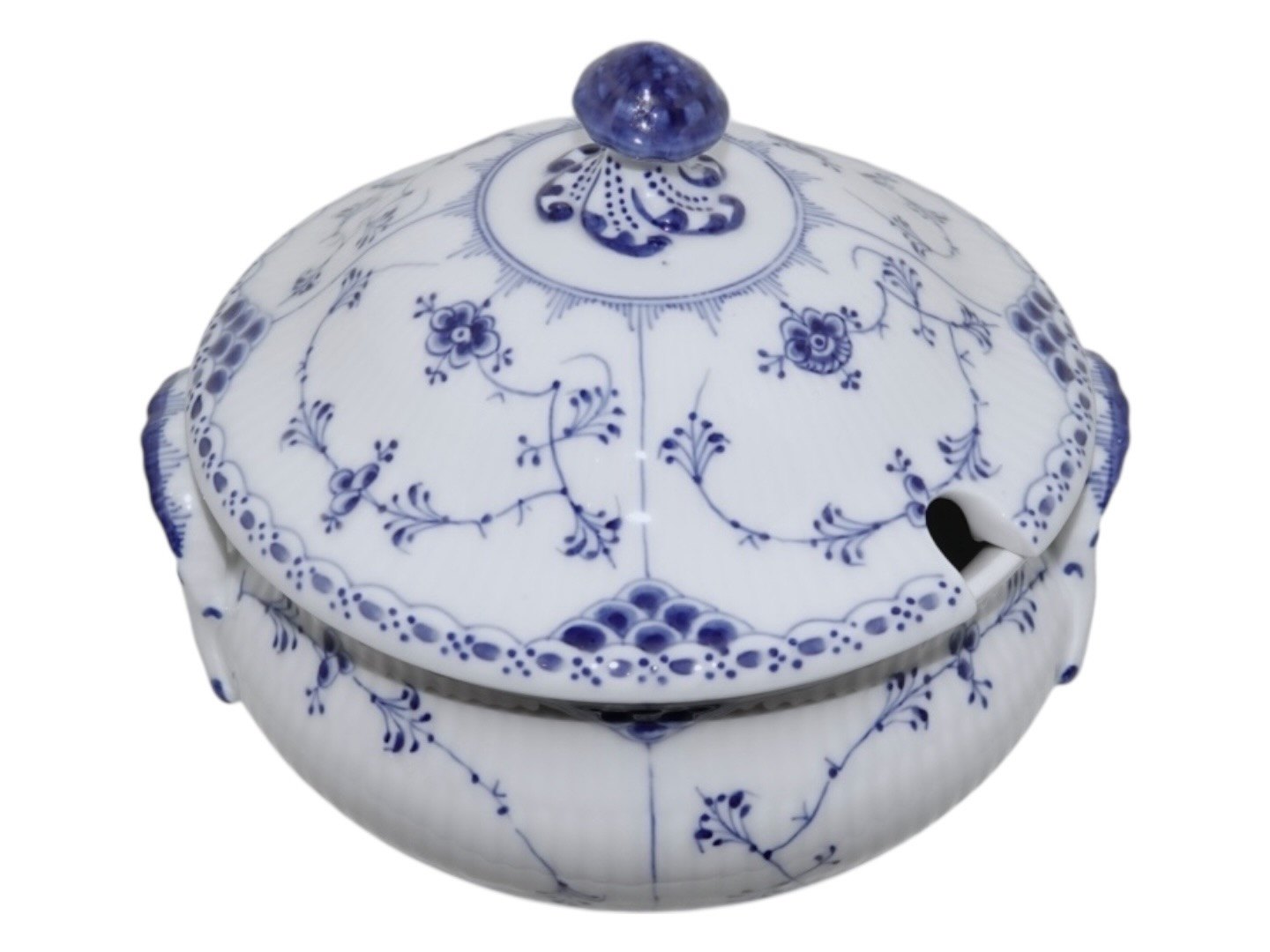 Kongelig Musselmalet Halvblonde, sjælden lille rund suppeterrin med låg.