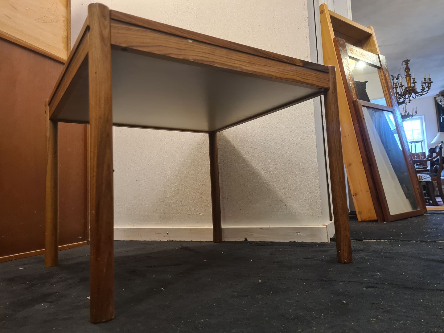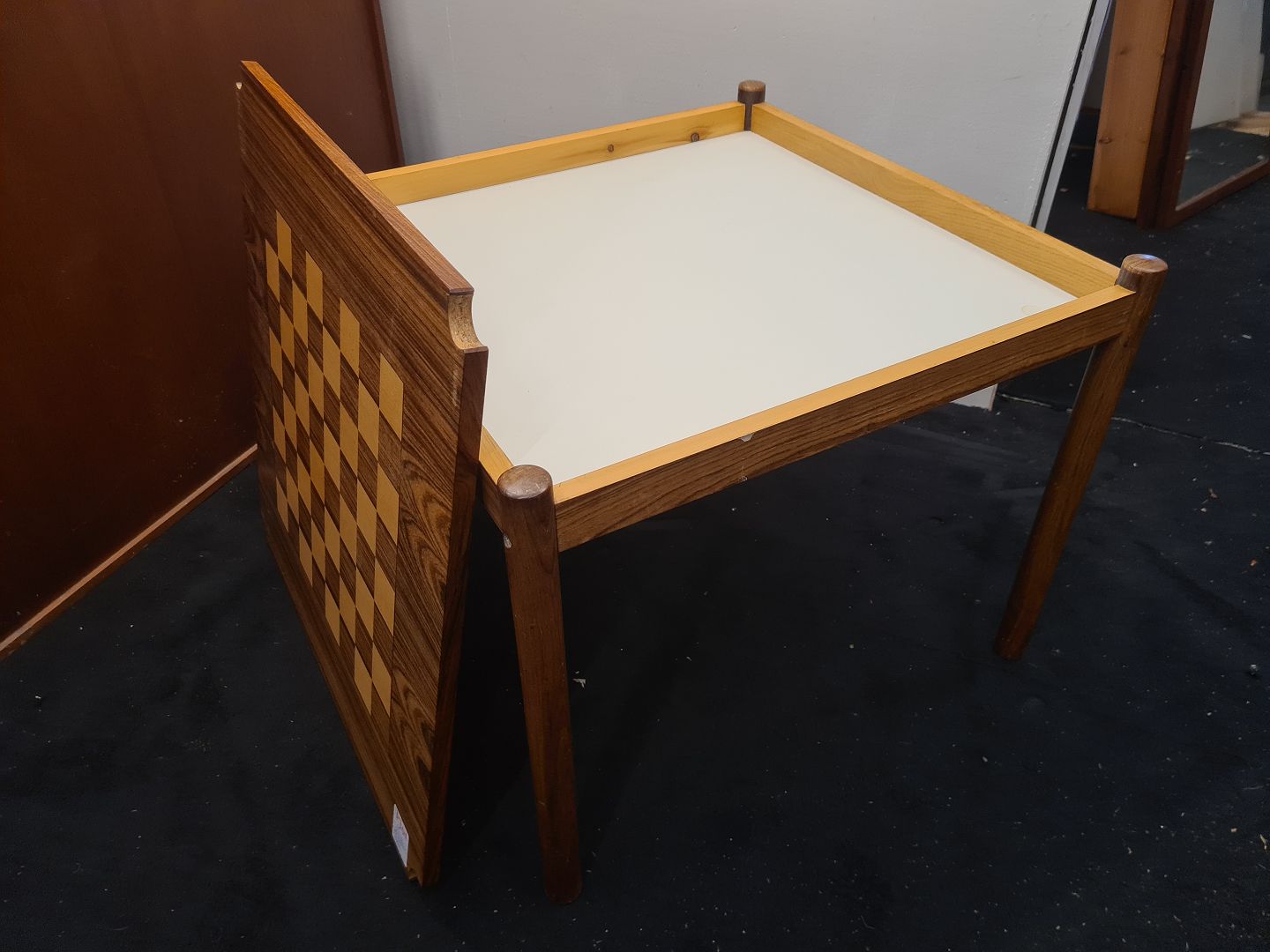 Kvadratisk skakbord i palisander fremstillet hos Georg Petersens møbelfabrik i 1970'erne. Fremstår pænt, velholdt og udmærket funktionsdygtigt.
