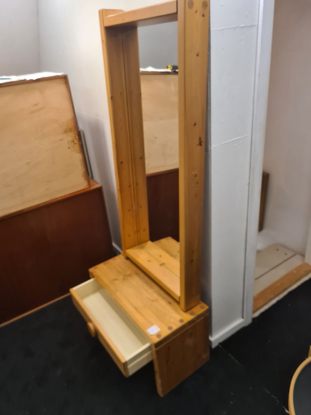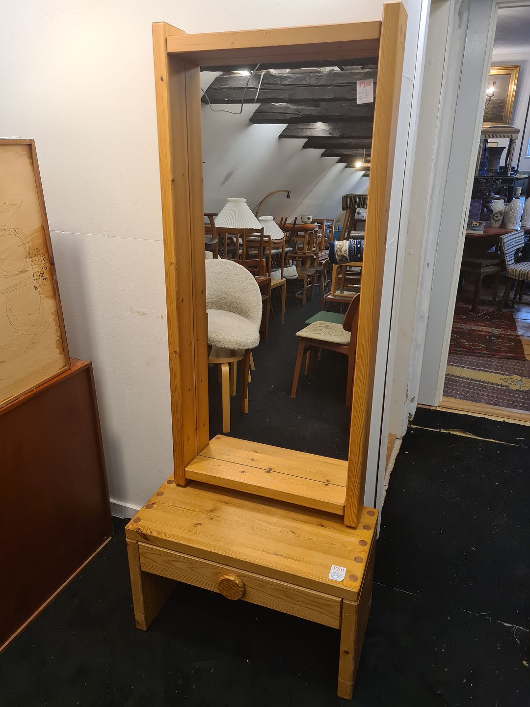 Svensk produceret entré møblement bestående af kommode og spejl. Fremstillet i massiv fyr i 1980'erne. Fremstår godt og ok velholdt dog med lidt overfladiske brugsspor.
