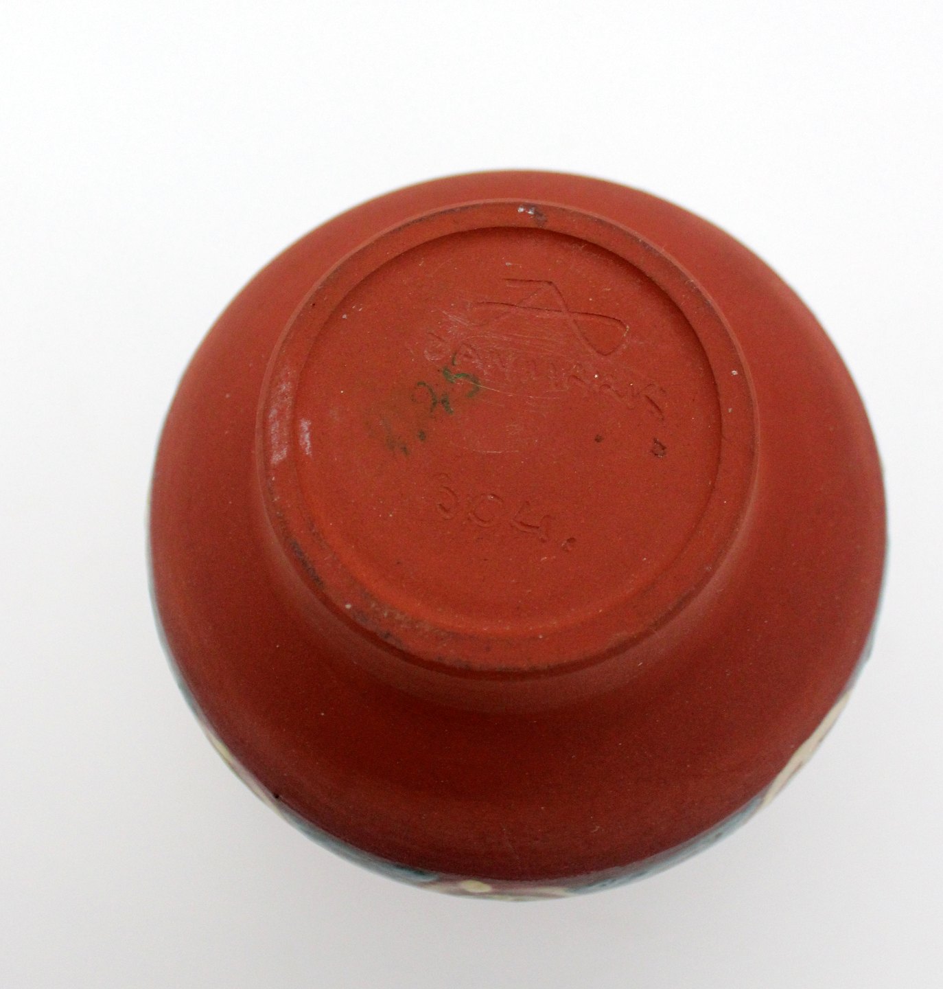 Johannes Andersen eget værksted. Vase fra 1950'erne. Rødbrun ru og mat glasur med bånd af grøn og blå glasur. Nr. 304. Signeret JA DANMARK. Højde 14 cm. Største diameter 10 cm. God stand, dog med en krakelering i båndet og så hvide prikker i den røde glasur. Pris: 250 kr.