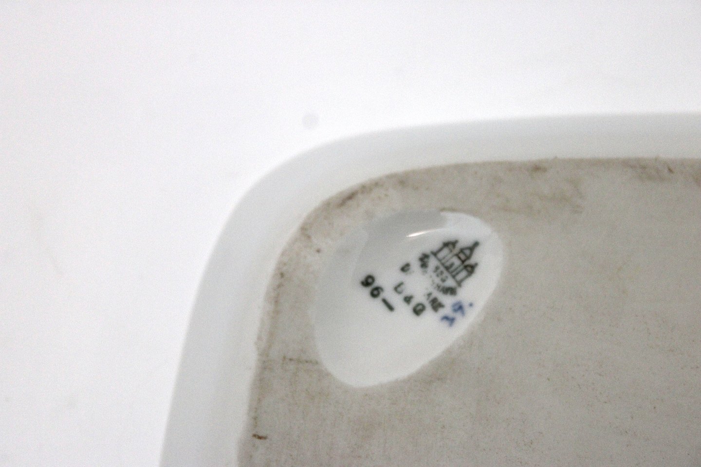 Aflang bakke til sukker og fløde. Kan bruges som serveringsfad eller spisetallerken. Nr. 96. II. sortering. Fin stand. 27 x 15,5 cm. Pris: 250 kr.