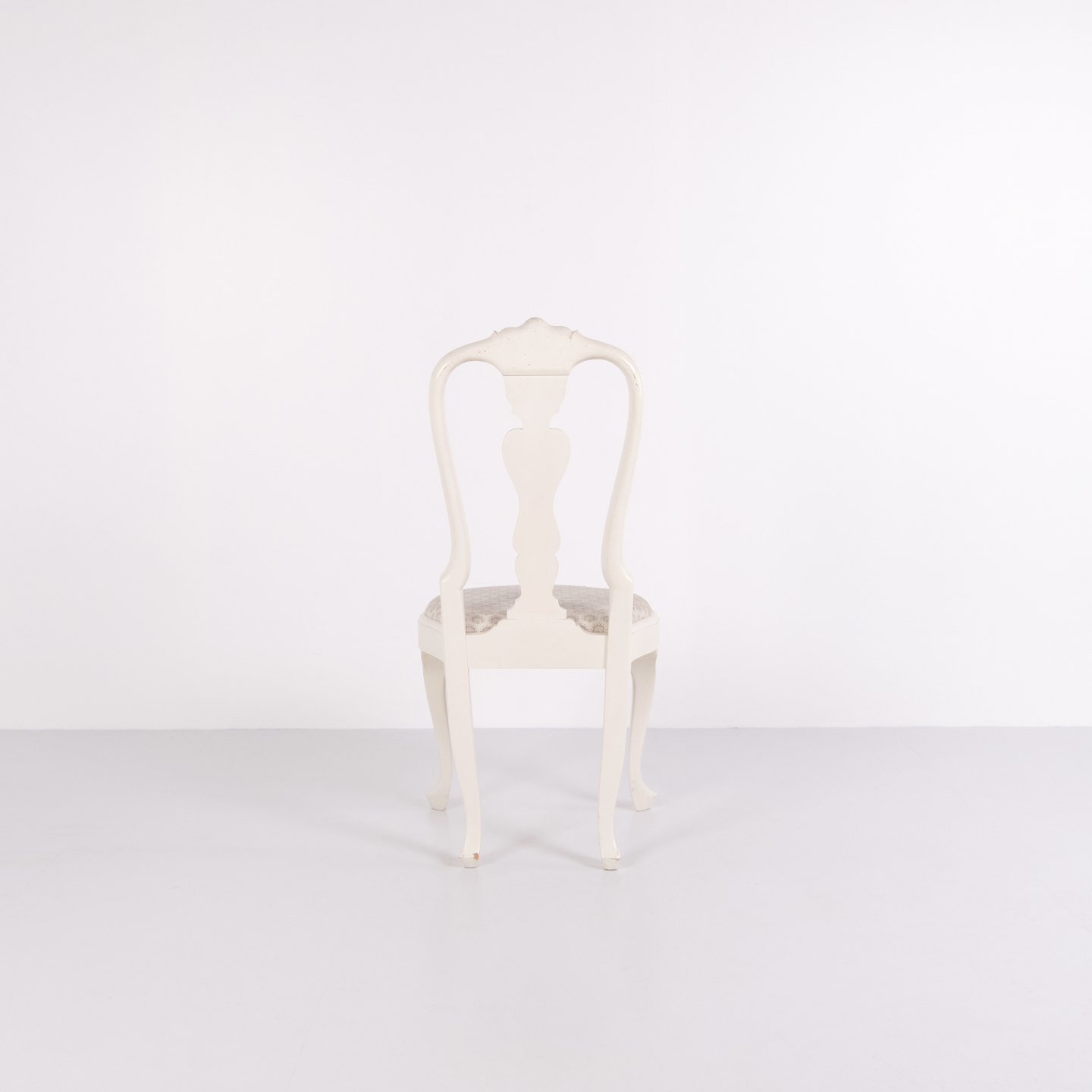 Antikke spisebordsstole i ny rokoko stil fra 1920’erne. Sæt af 6 hvidmalede stole med dekorative detaljer.