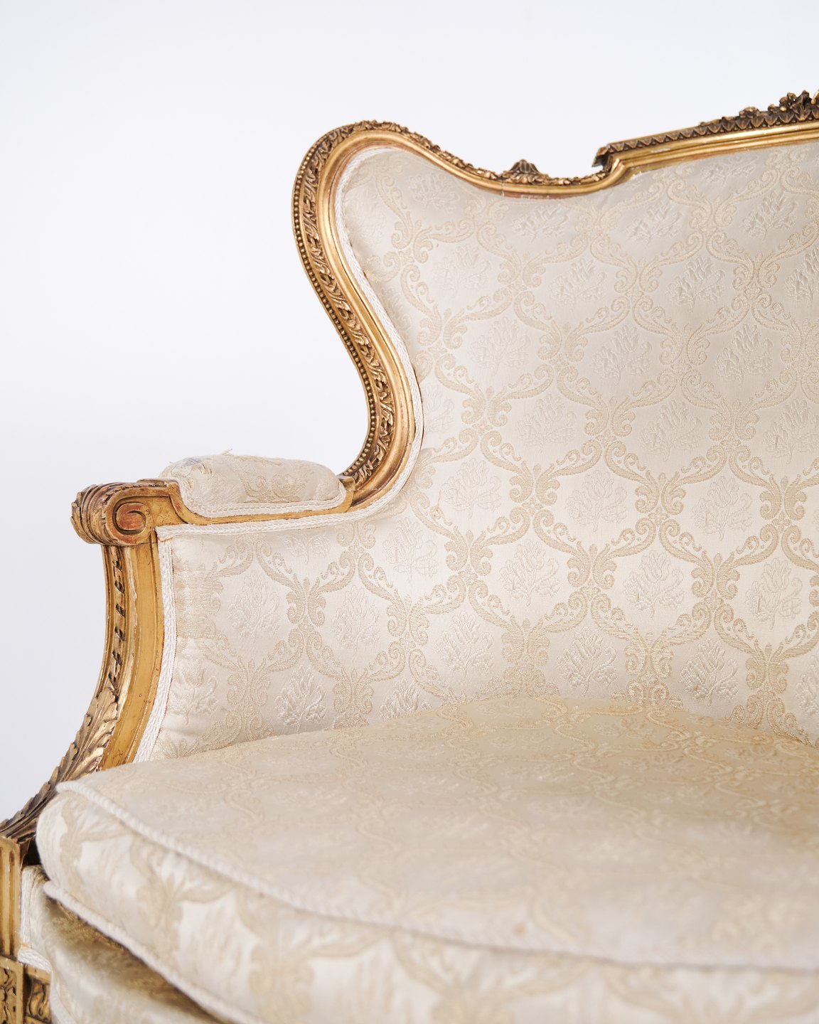 Antik bergère lænestol 1860’erne i Louis XVI stil. Forgyldt træ og lyst polster.