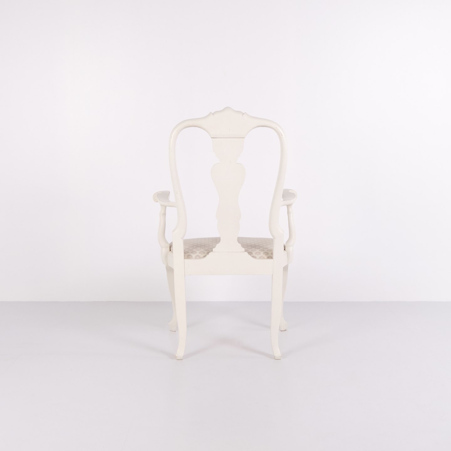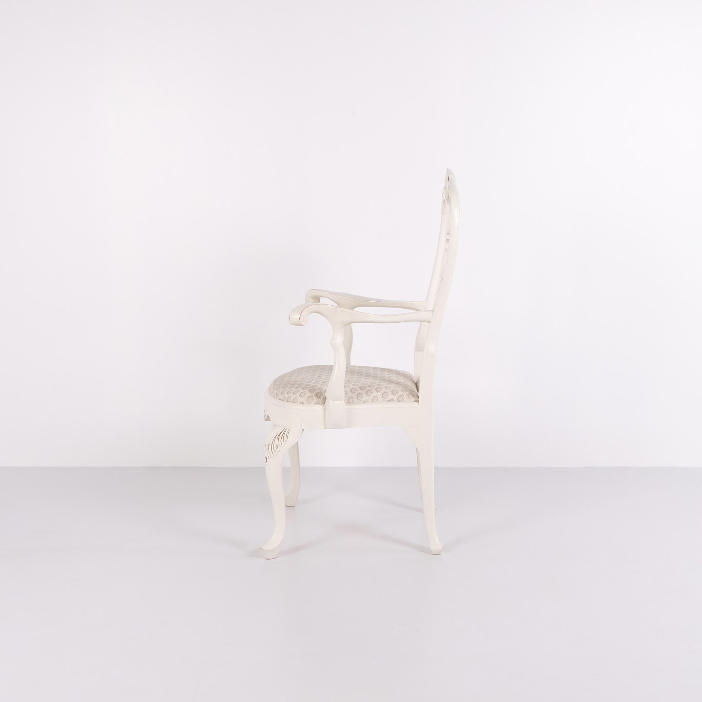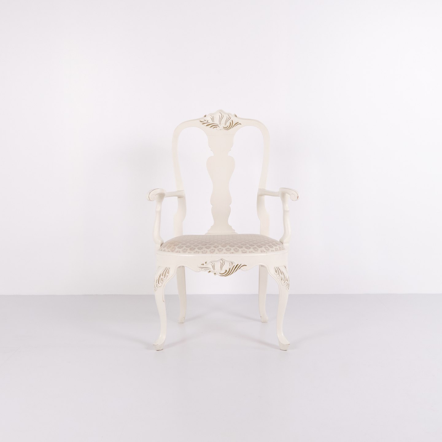 Antikke armstole fra 1920’erne i ny rokoko stil. Sæt af 2 hvidmalede armstole med dekorative detaljer. Antik rokoko møbelstil 1920’erne.