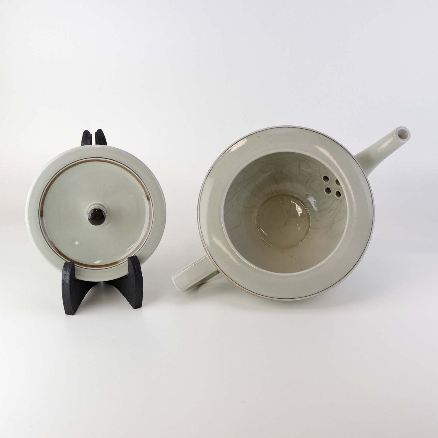 Fremstår med indvendige krakkeleringer i glasuren, lettere ujævn glasur på topkanten samt mindre brugsspor på glasuren ved tuden.