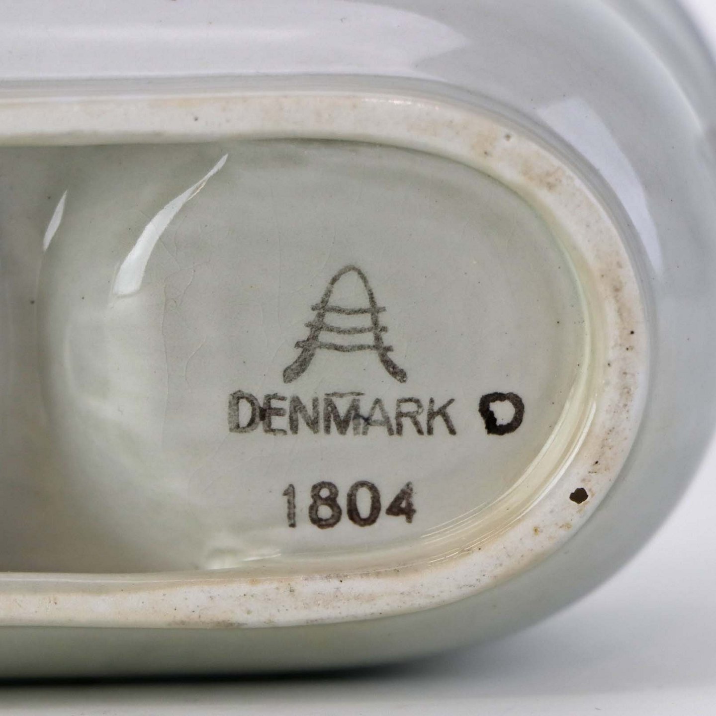 Sæt med to glasflasker til olie og eddike med prop i kar med hanke af fajance fra stellet Kirsten, som blev fremstillet i perioden 1934-1957.