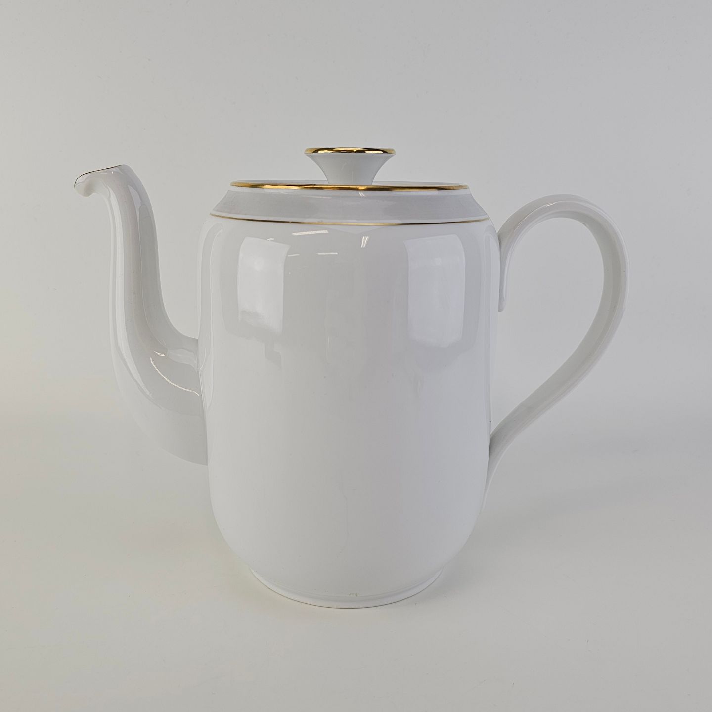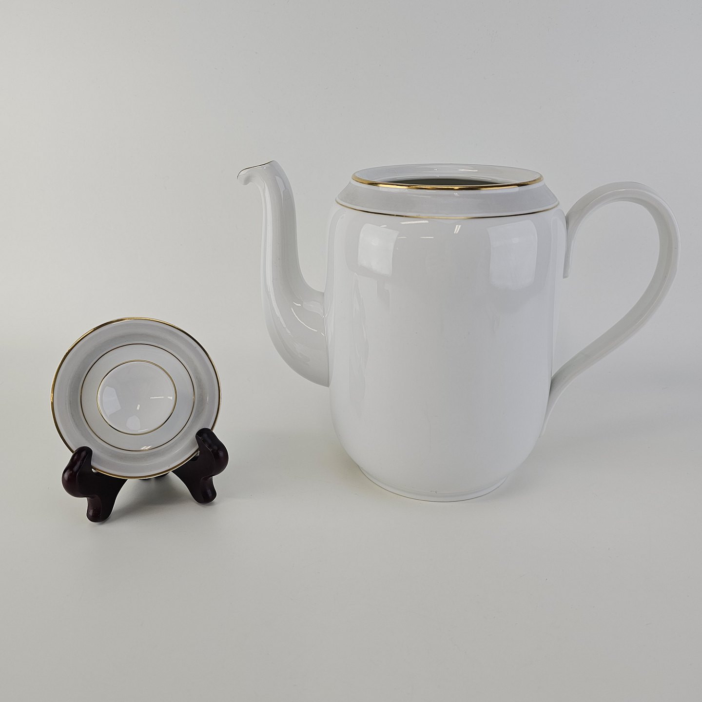 Tiber er stel i glat hvidt porcelæn med grå bort og guldkant