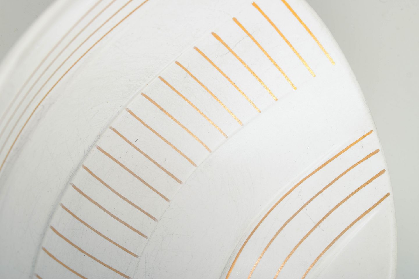 Large, organically shaped bowl in glazed ceramic with a subtly undulating relief and fine gilt decoration. Studio hand work, “Guldsurrea”.