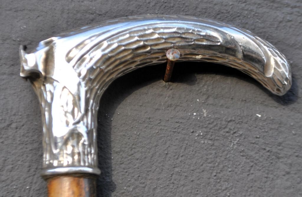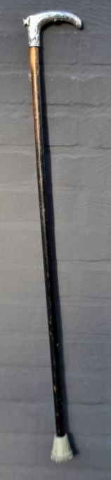 Stok i træ med sølvhåndtag, 19. årh. Håndtag dekoreret med riller. Utydelige stempler. Indgraveret: P. Med gummifod. L: 82 cm.