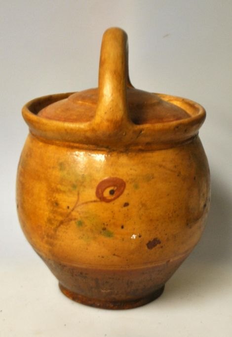 Sorring barsels potte, ca. 1860 - 1870. Sorring ved Silkeborg, Danmark. Med varm gul begitning. Dekoreret med blomster. Højde med hank: 21 cm.