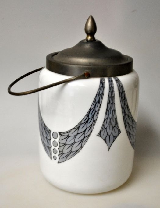 Bisquitdåse, Fyns Glasværk, opalhvid glas med påbrændt dekoration, 1910. Nr. 2287/429. Dekoration med kontur som overføringsbillede. Med metalbeslag i forsølvet nikkel med hank og låg. H. inkl. låg: 21 cm. Dia: 12,5 cm.