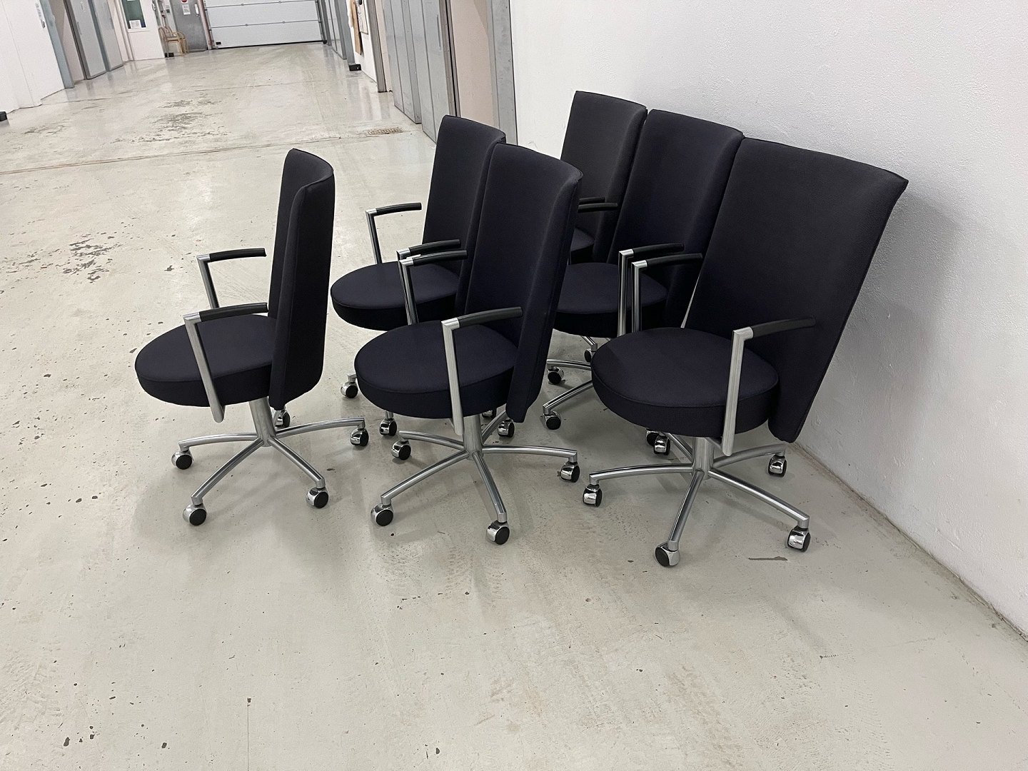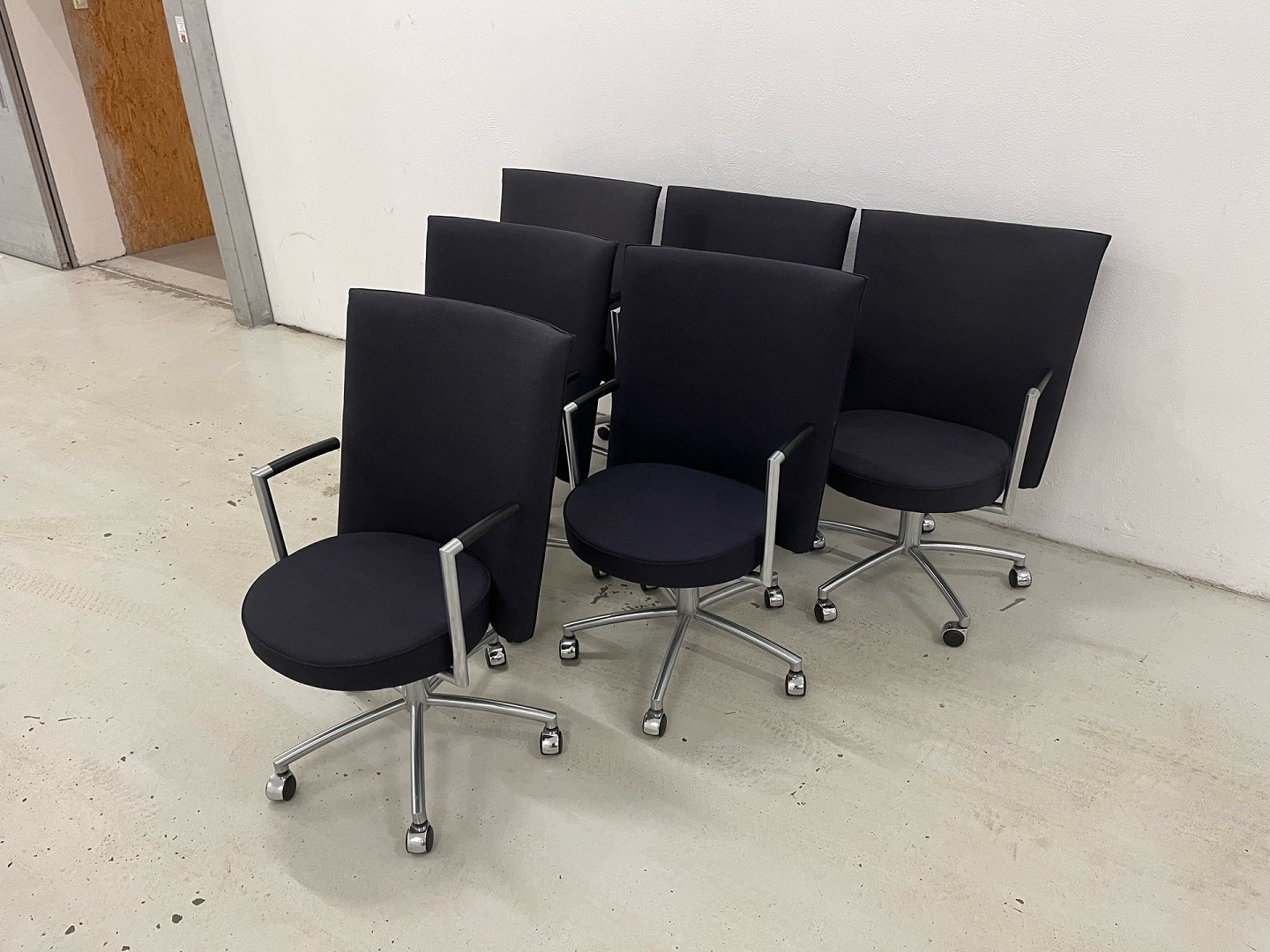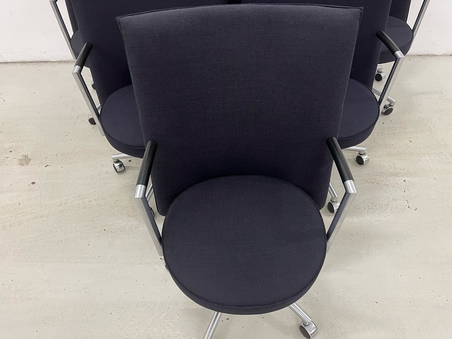 Stolene er udført i sort/blåt fastpolstret stof med stel i matforkromet stål. Oprindelig nypris pr. stol: DKK 18.995,-